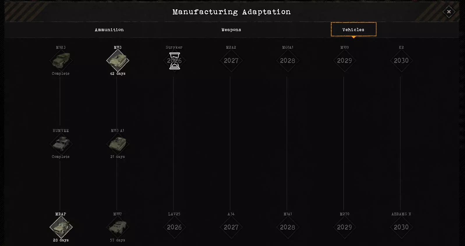 到目前为止,我还能暂时把士兵武器的弹药储备起来,因为依靠自身储备以及从被攻占城市运输物资,弹药供应在很长一段时间内都能得到保障。但很快,我就面临了战斗车辆弹药短缺的问题,不得不先建立生产线,才能重新为它们补给弹药并投入使用。不过这也与我自己的游戏风格有关。目前战斗车辆的战斗力极强,能够从远处消灭大部分步兵,所以我实际上主要依靠它们进行战斗。相应地,弹药消耗量也非常高。要找到合适的弹药,只需将鼠标悬停在相应的车辆/武器上,在弹出的方框中会有相关描述,其中就包括弹药信息。合适的弹药类型。 火箭筒对于防御敌方战斗车辆非常重要。不过这里的补给情况很好,我很长时间都不需要自己生产。 研究战斗车辆