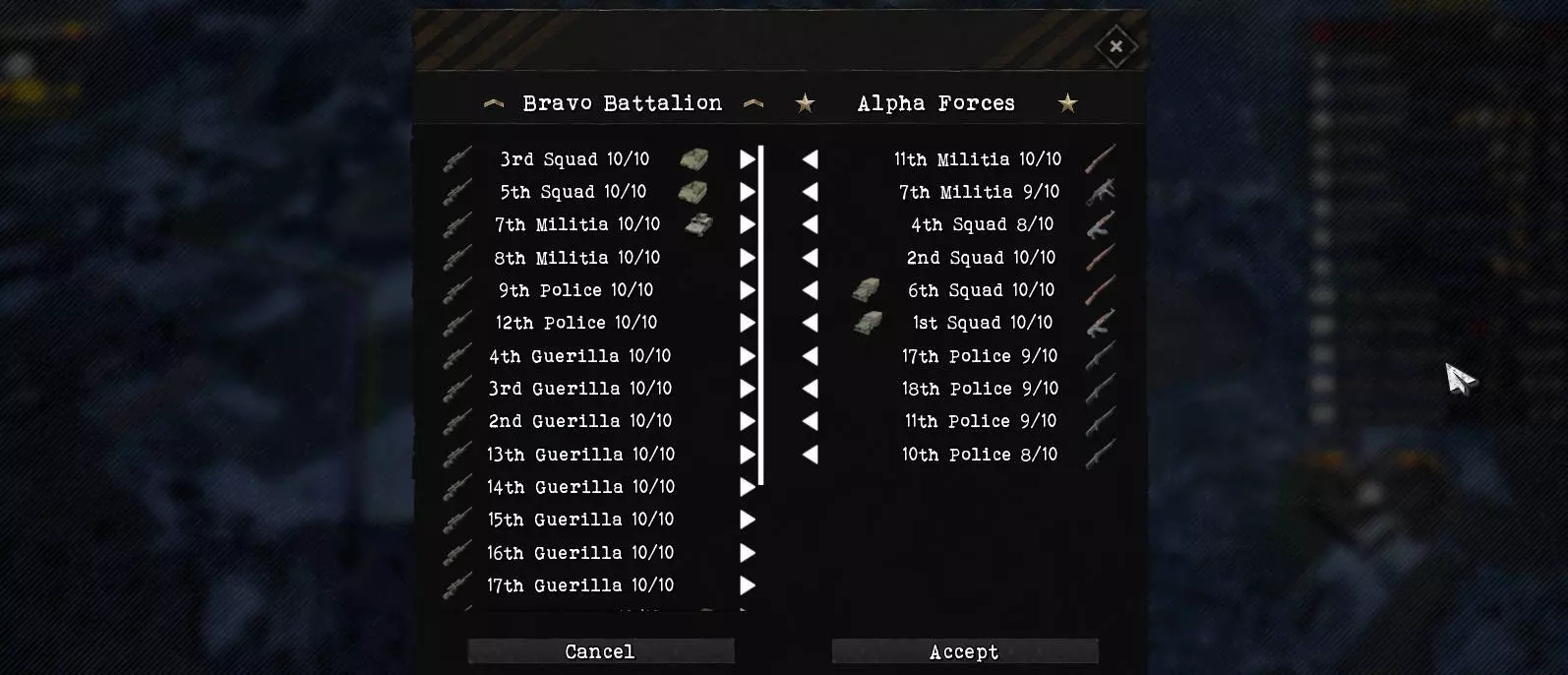 建立良好的关系需要时间。通过投入一些金钱进行贿赂可以极大地提高外交任务成功完成的概率。每次只能进行一项外交任务。通常需要多次任务才能建立更高价值的关系,例如贸易协定甚至联盟。只有关系改善后,达成这些协定的概率才会提高。 当你征服一个派系或变得更强大时,其他派系往往会采取敌对行动。当你与其他派系经过长期战争终于取得胜利,却在自身仍处于虚弱和恢复状态时,被另一个派系以生力军攻击,这种情况可能会让人倍感痛苦。通过外交手段,例如提前签订【互不侵犯条约】,可以避免此类情况的发生。 部队管理 从一开始,组建高效的营级单位就至关重要。为此,建议将地图上所有现有的机动部队集中到一个地点,组建一支强大的攻击部队。在地图上右键点击可创建一个目标标记,部队将在游戏开始运行后前往该标记处。当两个营相遇时,你可以通过点击白色小三角箭头来互换小队。