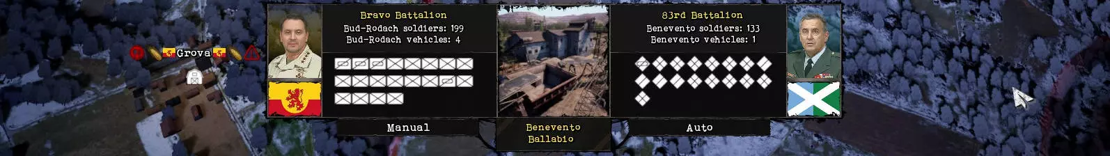 战斗 最后是战斗环节,这关系到领土的攻占或本国的防御。在地图上右键点击,将移动标记拖动到敌方军队或城市即可发起战斗。军队旁的数字代表小队数量,例如标有数字7的叛军即有70人(7个小队,每队10名士兵)。战斗开始时,会显示双方军队的规模以及参战的战斗车辆数量。你可以选择自动计算战斗结果。如果有足够的经验,较难的战斗最好手动操作。