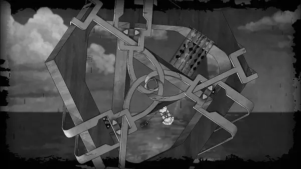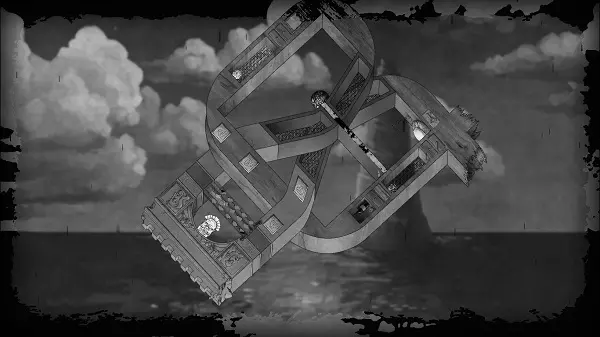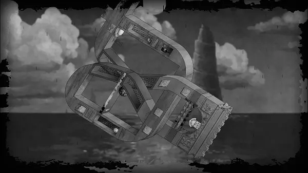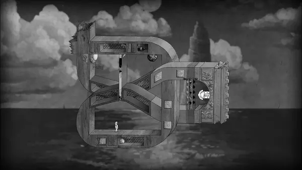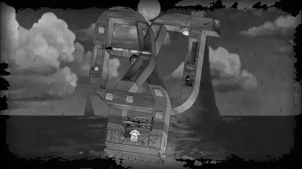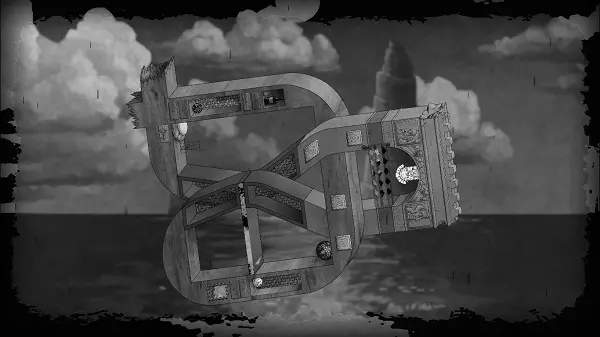 向右移动,同时旋转屏幕。最终,板块应回升到另一个房间,而球体则会出现在天花板上。之后,向左旋转画面,使球体落下(更准确地说是上升)到按钮所在的位置。向左移动两步,然后通过最近的符号翻转画面。向右移动,直到到达幕布后面。将画面向右旋转,使方块向下掉落,而球体仍处于方块右侧——大致在方块和按钮之间。完成后,操控角色向右移动至幕布的另一部分。旋转画面,让球体落在按钮上——此时按钮位于屏幕左上角。向右移动,走过平台,一直向右走到翻转标志处,然后翻转画面。向右绕圈走到门前并穿过它,因为球会按下按钮。第四章完成。 结局。 向左走,翻转画面,走到幕布后面并将镜头稍微向左转动。向左走,翻转画面使石板移开,露出通道。在石板关闭前从下方斜着穿过去。沿着桥向右走,观看游戏的最终 credits。在它们之后,你可以体验同样的关卡,但呈现为镜像模式。这些关卡难度更高,但借助上文对每个关卡的详细说明,你应该能够应对。如果你仍有困难,可以参考我在网上找到的相关视频。对于那些充满好奇心的玩家,我想说,我认为没有必要再次就已通过的关卡展开争论,因此才插入视频作为辅助。