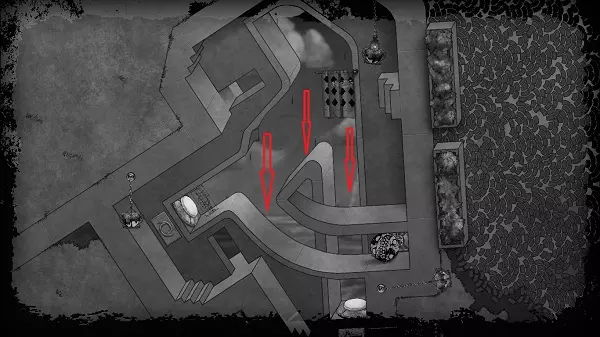 接下来向右走,旋转画面。沿着那块石板向右移动,以便掉落到之前有球的下方。此时石板会向上抬起,挡住同样滚入另一个房间的球。球会在右侧。