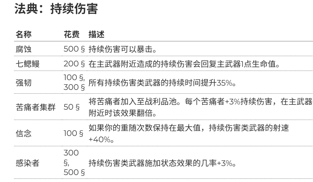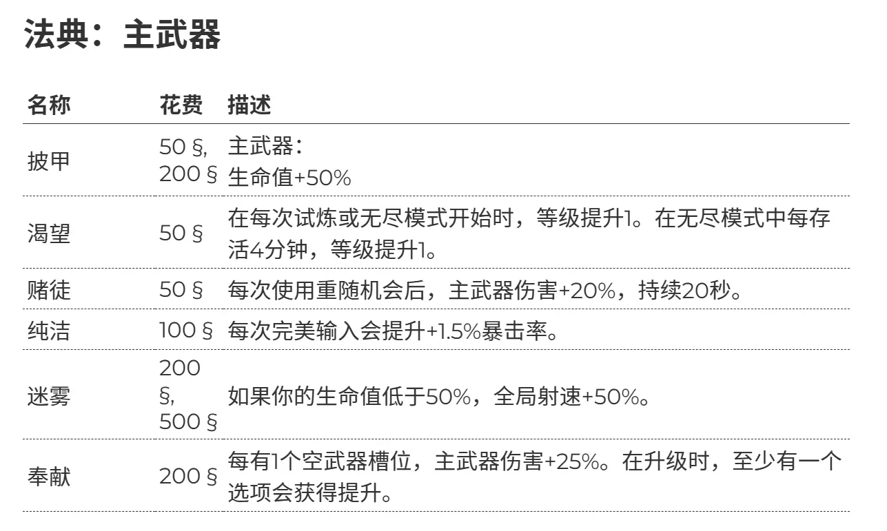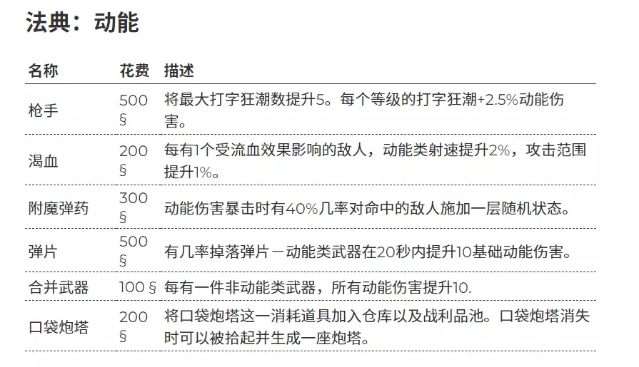 当然如果你觉得自己有足够把握不需要额外回血,可以选择带上闪电战以及持续攻击的腐蚀天赋,能够大大加强无人机以及猎手的输出能力。 主武器连发枪 使用单个主武器最重要的是要有足够的清怪效率,以下为你提供建议的进化方向和天赋选择。 进化:两个反弹效果必选,可大幅提升清怪效率,再搭配一个霜咬效果增加容错率。 助力:由于连发枪对助力没有特殊要求,所以主要在主武器法典中进行选择。对于所有主武器而言,奉献、纯洁、渴望这三个助力最为重要,再加上两个披甲效果提升容错率,剩余一个助力可任意选择。如果宝藏中能开出吸血惊情,那也是必选的助力。
