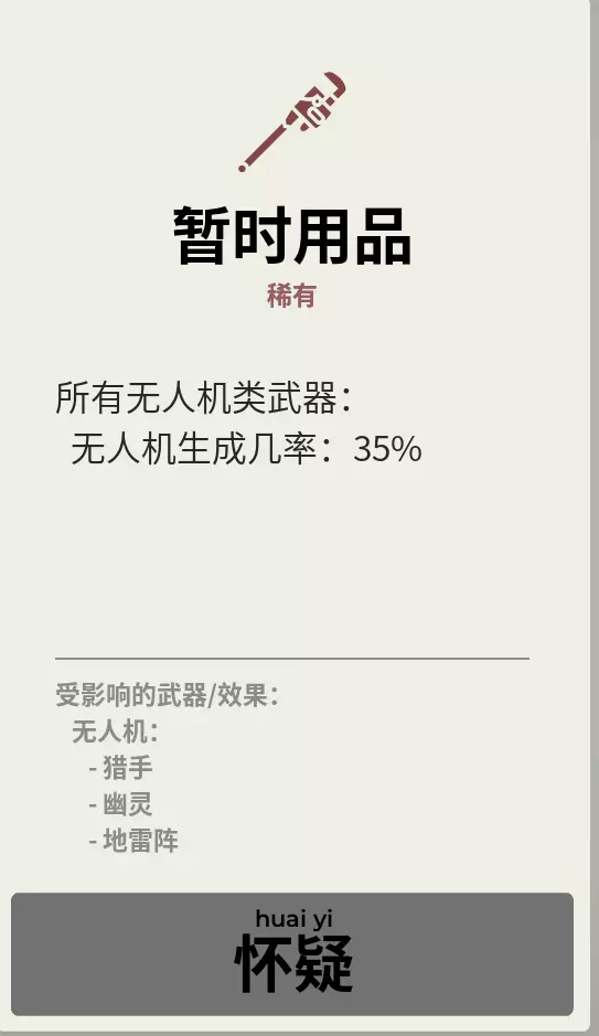 无人机优先选择猎手,其次地雷或和灵。地雷不建议选择追踪,追踪会导致地雷快速消耗,对于高噩兆来说会使得我们打字压力上升。剩下一个格子可以选别的无人机武器或者别的想玩的也行,主升猎手即可。猎手是我们主要的输出武器。 boss战之后可能刷出一个增加无人机生成的奖励,真乃神中神,必选 总而言之就是场上的无人机越多越好。