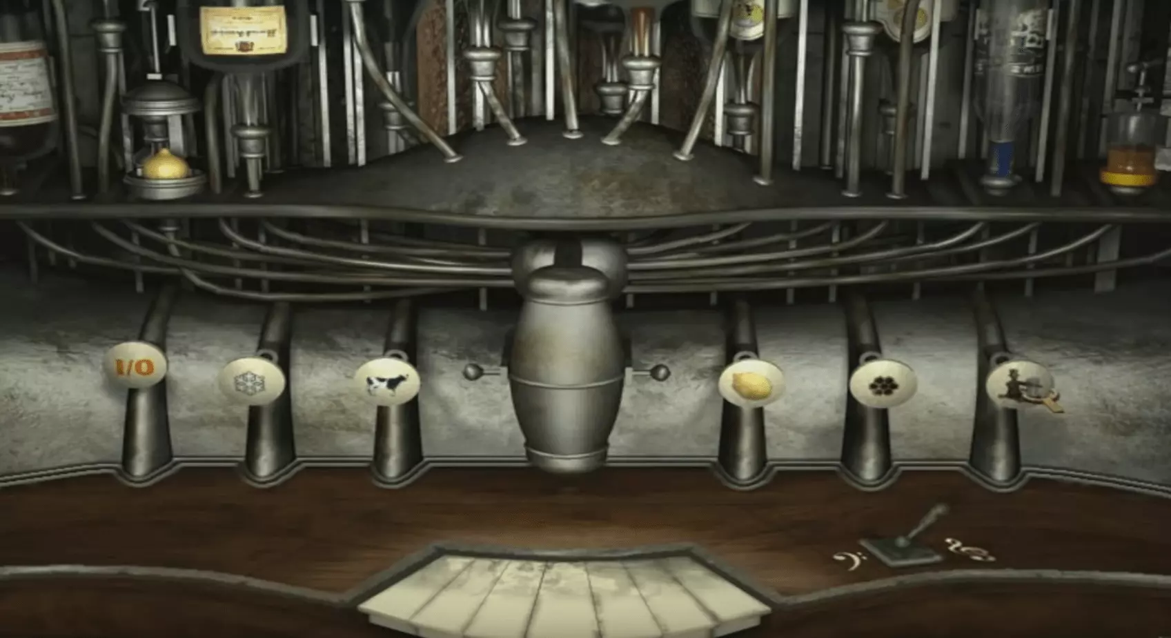 如何进行混合? 首先,你需要将所有原料放入搅拌站。 仔细检查吧台的顶层架子。那里有一卷说明书(靠近中间位置)和三个空分配器(3个)。 1. 瓶子:你有伏特加酒瓶(从恰罗夫上校那里获得)。将其放入左侧的位置。 2. 酸橙:现在看向吧台右侧下方。在冰箱里你会找到一个柠檬和一瓶结晶蜂蜜。将柠檬放入左侧的柠檬榨汁器中。 3. 蜂蜜:蜂蜜已经结晶,所以你需要将其转化为液体形式。绕到泳池的另一边,来到热水浴缸处。转动墙上的轮子打开蒸汽,然后将蜂蜜放入热水浴缸中。这样蜂蜜就会融化。将其放入右侧剩下的空分配器中。准备好调制鸡尾酒的材料。 当你放置好这三样物品后,就该施展“魔法”了。 4.启动机器。按下输入/输出按钮。然后查看之前卷起来的便条。它提供了关于瓶子的信息。你会看到: