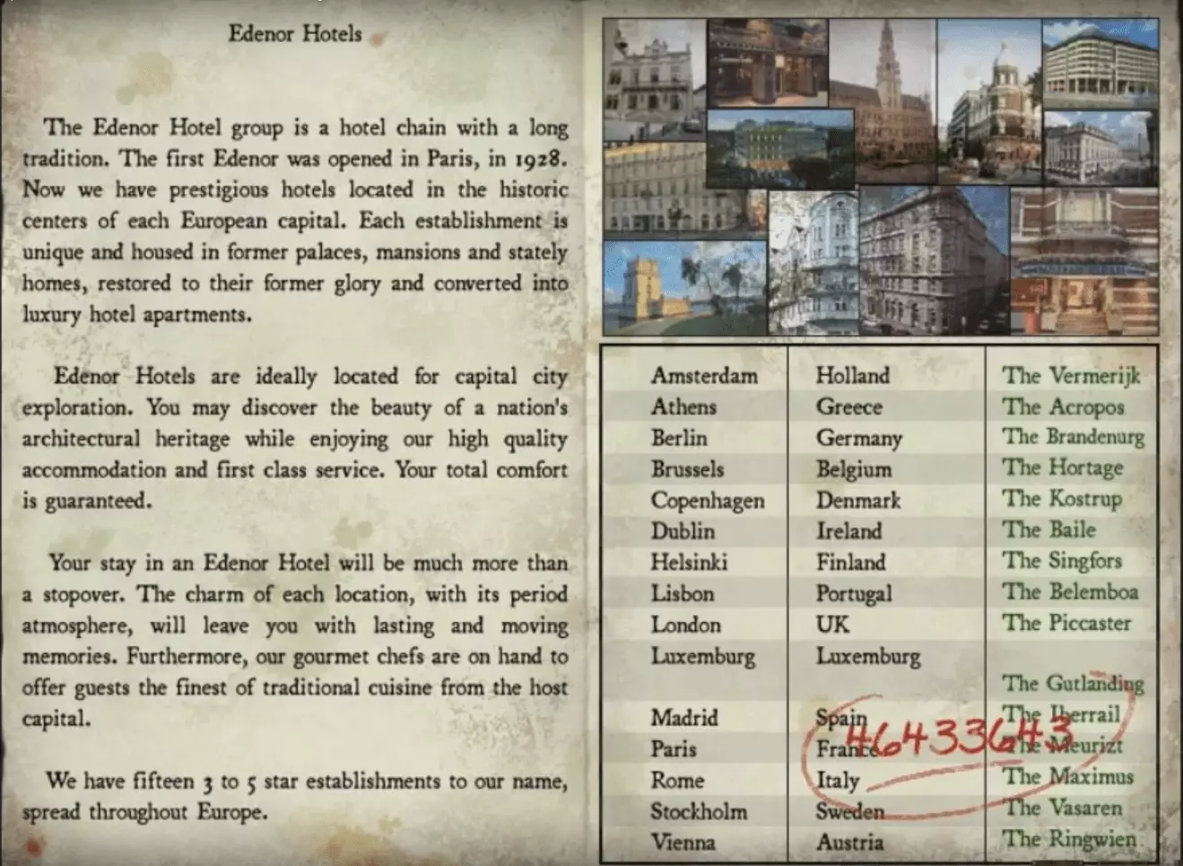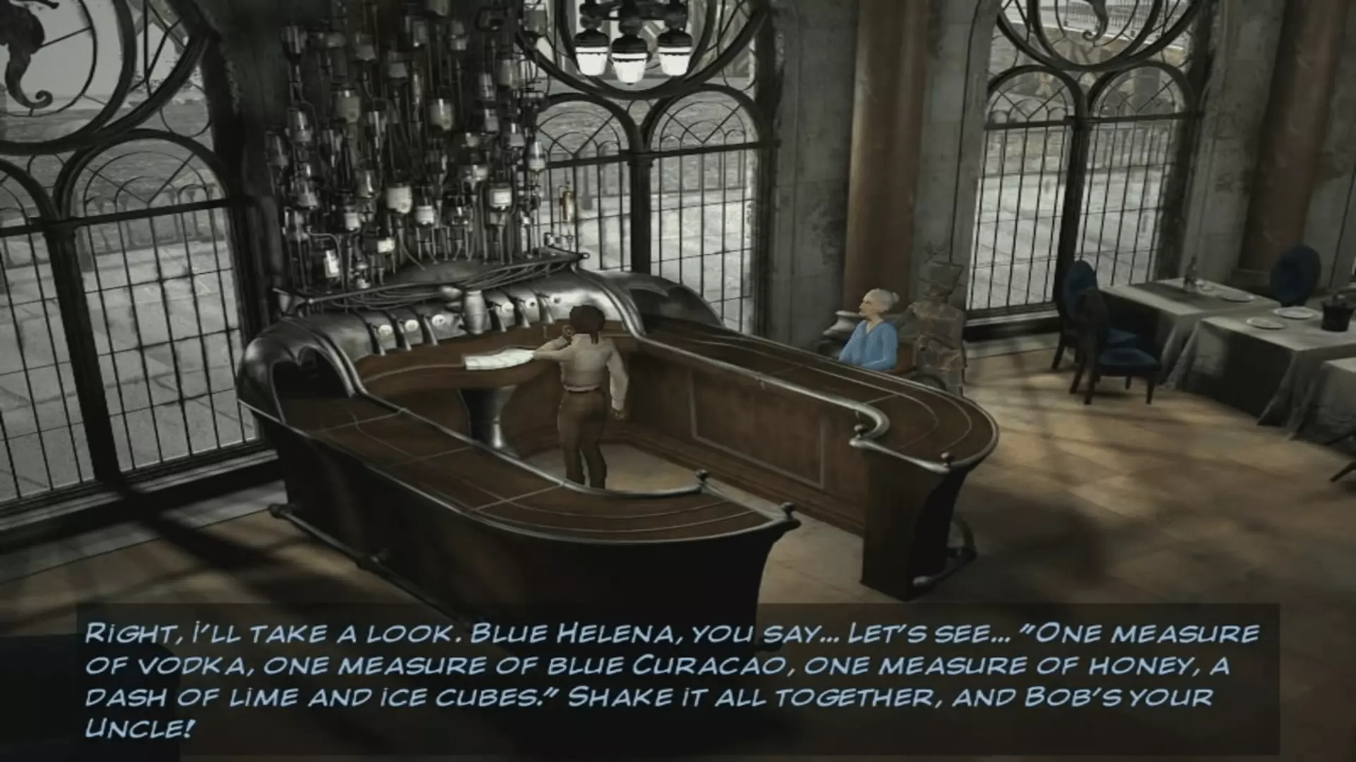 前方剧透: 酒吧任务在詹姆斯(自动护士)将海伦娜·罗曼斯基夫人带到酒吧,并且你和她谈论“汉斯”之后开始。 她提到一种由默里茨酒店名叫乔治的酒保为她调制的鸡尾酒。在一次寒冷的巡演中,这种酒帮助她恢复了嗓音。她对其效果非常满意,但酒保为了保住自己的工作,拒绝告诉她配方。 这家酒店听起来很熟悉,因为它出现在你从接待处(登记台)拿到的小册子上,尽管拼写有误。小册子上写着它的电话号码(464 33643)。用你的手机拨打这家巴黎酒店的电话。遗憾的是,你会发现他已经不在默里茨工作了,但现任酒保会给你他留下的【蓝色海伦娜鸡尾酒】的配方。