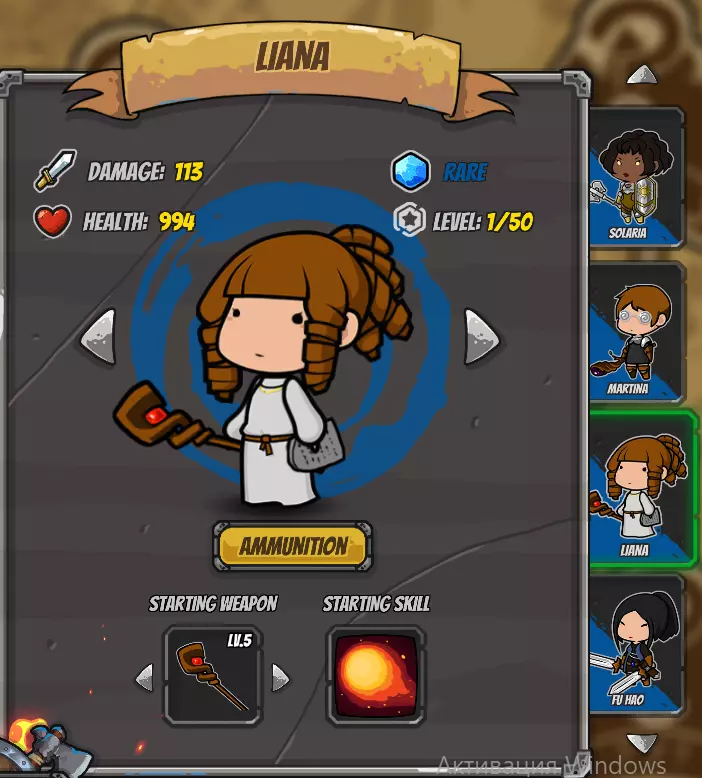 在窗口的上部,你可以看到所选英雄的所有属性:伤害、生命值、稀有度和等级。 点击英雄两侧的箭头,可以快速切换到另一个英雄,无需前往右侧的列表。但如果你更喜欢通过英雄头像来选择,也可以在右侧点击箭头进行操作。 如果你忘记给英雄装备 gear(装备),按下【Inventory(背包)】按钮,你将立即回到家园,在那里可以选择所需的装备。 你不仅可以在家园选择武器,还可以直接在战斗窗口中进行选择!点击下方窗口的箭头,系统会显示你背包中可用的武器。