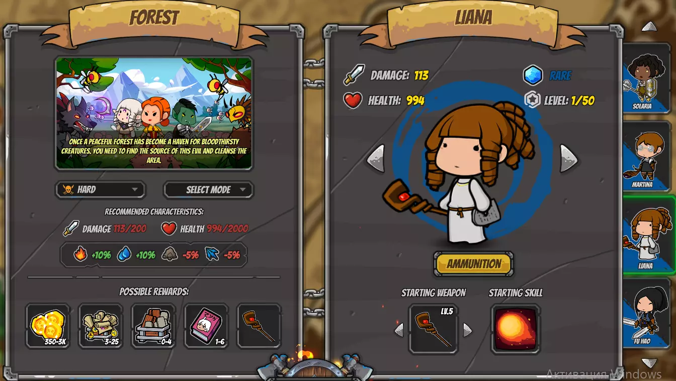此外,请注意不同地点和难度等级会有不同的增益效果,例如在简单难度的森林中,火元素和水元素技能的伤害会提高15%。 现在来谈谈英雄及其装备。