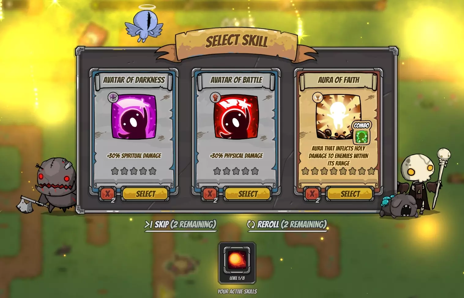 当整个进度条填满后,会弹出一个窗口,里面有三个技能可供选择,请明智选择!每局游戏提供的技能都将完全不同。