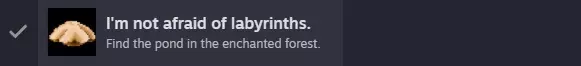回到德鲁伊村庄。 进入公共房屋,将你的新战利品交给部落首领,最终获得迷幻草叶子。 离开后继续向左走,直到进入地图界面,前往岛屿。 与女巫交谈并询问关于魔法森林的事,以获取继续前进的提示。 离开后选择魔法森林作为下一个目的地。 向上走开始解谜部分。 现在你需要利用女巫给的提示在这个区域导航。 到达花朵区域的方法:观察石头上的苔藓(棕色斑点),从它们指向的一侧(即苔藓较厚的一侧)的出口离开;如果看不到棕色苔藓,则表示指向上方,那就是要走的路,至少这对我来说是有效的!你最终会看到黄色的花朵。在这里,根据女巫告诉你的内容改变方向。 如何继续:她让你向东走,所以找到苔藓朝向的方向,然后从它所指方向右侧的出口离开。 到达池塘后,你将获得I'M NOT AFRAID OF LABYRINTHS成就。
