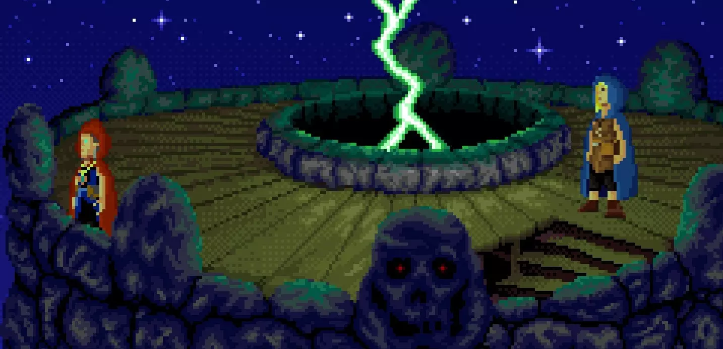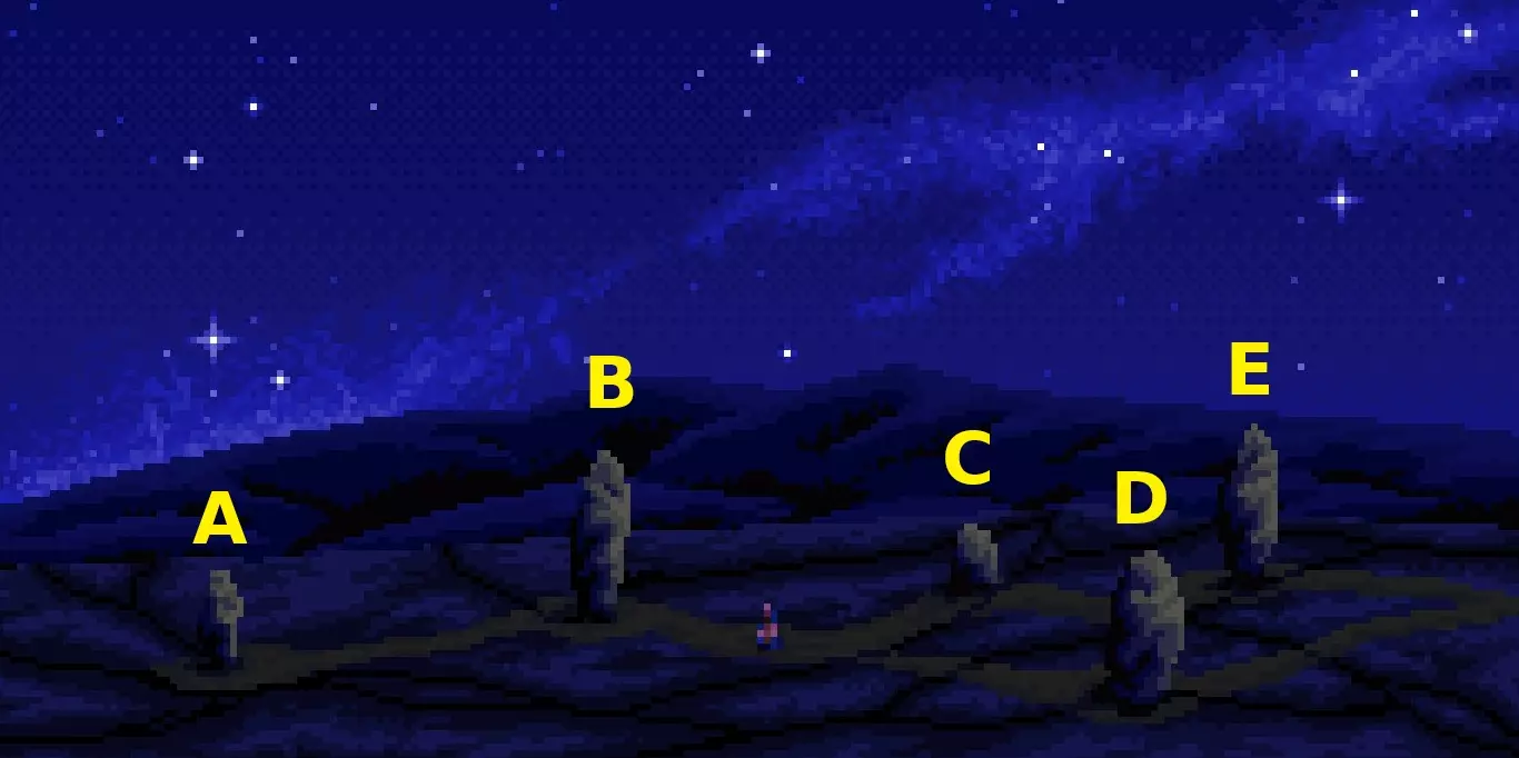 查看巨石柱,将石环与凹槽结合,推动石环两次以触发场景。向左走,到达有若干巨石柱的区域。