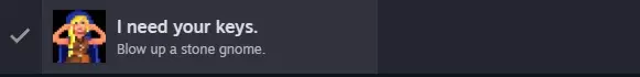 首先将小路上的柠檬用在中间的沟渠里,然后把牛脂鱼用在它右边的扁平岩石上。捡起蛤蜊。 离开前,捡起屏幕左侧的细枝。 在这个新区域,获取地精哨兵左边的骨头。 返回地图界面并回到地精营地。 将骨头与啄木鸟互动,把它变成多孔骨。 和地精们谈论被堵住的矿洞,结束后退出到地图界面,前往德鲁伊村庄。 进入公共房屋。 将蛤蜊放在平底锅上,然后用锅铲在平底锅上操作,最终获得珍珠。 将引信放在这里的火上,得到燃烧的引信。离开房屋,在你的物品栏中,将燃烧的引信用于引信上,以获得另一根燃烧的引信,否则它会在下一个场景熄灭,你将不得不重新开始。 向左离开。 在十字路口,将燃烧的引信用于引信上,以再次获得燃烧的引信,然后向右上方离开,前往萨满的房屋。 将你的炸药用于拿着钥匙的石头地精,将燃烧的引信与炸药配合使用,将其炸毁,即可获得【I NEED YOUR KEYS】成就。