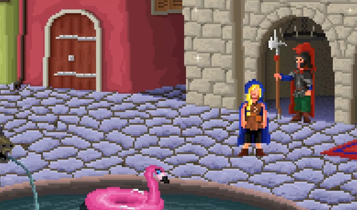不过在庆祝的时候记得捡起那只被麻醉的松鼠! 现在把浮板放在右边的石堆上,然后用手锯锯掉巨大的黄蜂巢,把它捡起来。 【成就警告:把浮板留在这里!】它放在石头上很安全,我们之后会回来拿的,如果你现在捡起来,出于剧情原因你将无法再使用它,并且会错过一个相关成就。 回到城市。 进入玛丽亚枪械店。 把巨大的黄蜂巢交给店主,领取一些儿童用的箭。另外把会员卡给她,以获得一些决斗用的眼罩。离开这里,向右走两次到达喷泉广场。 用磁力钓鱼竿在喷泉水里收集一些镍币。将这些镍币和纸船组合,得到一个,嗯,带硬币的纸船。现在向左走两次,进入面包店的作坊。 从托盘上拿起巧克力面包,在物品栏中将其与装有硬币的纸船组合,制成装有面包和硬币的纸船。 用旧绳子与活板门互动,再使用活板门上的旧绳子使其重新回到物品栏,然后将其与天花板上的灯互动。现在拉动旧绳子,露出运河。 建议在此处存档,以防错过小船! 将装有面包和硬币的纸船放在运河水面上,离开面包店并向右走一次。 现在等待纸船出现在运河上,用你的磁性钓鱼竿与它互动,取回巧克力面包并获得【I HIDE NOTHING UNDER MY CLOAK】成就。
