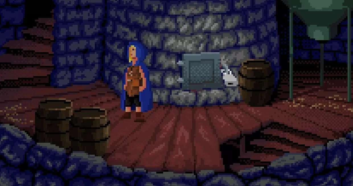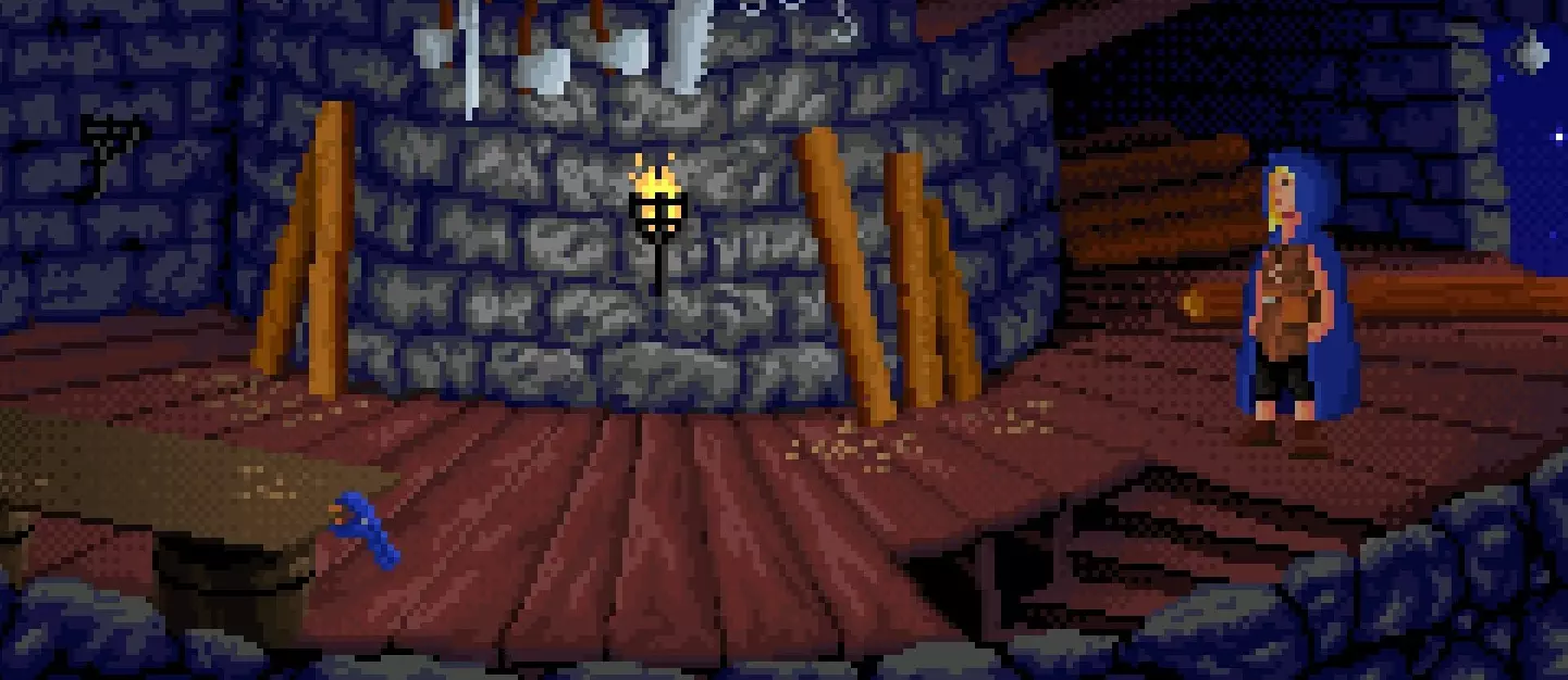 从床上拿起梳子,再拿起你左边的大白蜡烛。 将木工夹与梳子组合,制成带梳夹子。 用多孔骨抓住一只老鼠。将其与口套组合,得到带 harness 的老鼠,然后将其与带梳夹子组合,最终得到带耙子的老鼠。 鳗鱼水缸里有一把钥匙,用你的鱼竿去钓它。 用带耙子的老鼠对着地板上的洞口使用。 用多孔骨把老鼠弄回来,最后拿到钥匙。 回到一楼,使用楼梯/梯子下去。 拿起右边的锅,把它放在火上。 将蜡烛与锅结合,然后拿起锅得到液态蜡。 爬上梯子上楼。将液体蜡涂抹在你缠过绳子的圆木上,推动那根圆木制造一场小“意外”。 下楼并离开塔楼。 从破损的石像鬼那里拿起水槽。 回到塔楼内,继续爬楼梯,直到抵达这个房间。
