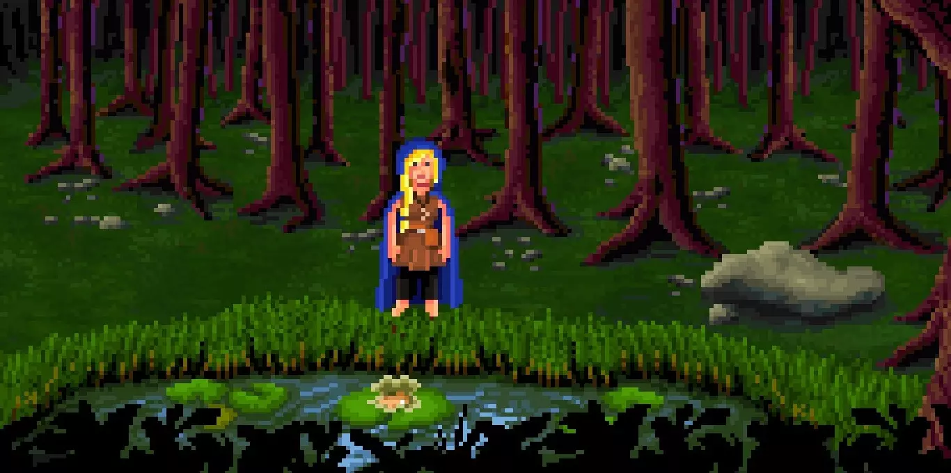 用你右边大石头上的扑克牌撬开石头,抓起你发现的虫子,将它和你的鱼竿组合,制作出带饵的鱼竿。试着捡起蛤蜊触发场景,用带饵的鱼竿在池塘水域中钓一条牛脂食人鱼。这里的事情已完成,退出到地图并前往地精营地。
