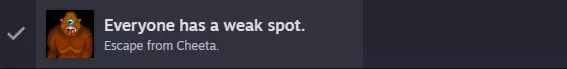 在斯凯左边有一块平坦的岩石,从你的物品栏中取出一些萨满蘑菇或玉米粒放在上面。 绳子会掉落,再在平坦的岩石上放更多食物,使其向你这边移动,然后捡起绳子。 将绳子用在栏杆上,再捡起来并把它用在平坦的岩石上,最终绳子会系在右侧,岩石顶部会出现一个绳套。 在平坦的岩石上放置食物,这样你就能把野兽捆起来,现在用你的吹箭筒对准眼睛(不是奇塔本身,而是她头顶上的眼睛热点!),然后向右穿过洞口。 逃离这个地方可以获得EVERYONE HAS A WEAK SPOT成就。