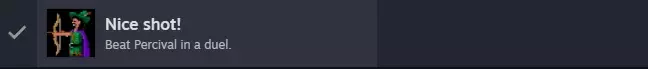 现在暂时离开城市,前往空地。 把决斗用的眼罩交给珀西瓦尔,和他对话并请求用你的眼罩进行射击。在他戴上眼罩时你会重新获得控制权,一定要在他准备好之前从他右边抢走一面旗帜。 用旗帜和被麻醉的松鼠组合,很明显就能得到带旗帜的松鼠。 离开空地,回到城里的屠夫那里。 把带旗帜的松鼠给他,等他允许后拿起他左边的公鸡。 在你的物品栏里,将断箭和公鸡组合,哈哈,就能得到一支鸡箭。 离开城市,回到空地。查看箭靶上的提示,与珀西瓦尔对话并要求再进行一次蒙眼决斗。趁他准备时,使用屏幕右侧箭支中的【种类箭】。他射击后,将弓与【小鸡箭】组合即可获胜。你的奖励将是珀西瓦尔给的地图和NICE SHOT!成就。