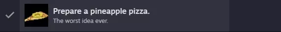 现在在你的物品栏中,用小刀与菠萝罐头互动可获得一片菠萝,将这片菠萝放在披萨片上即可制作出菠萝披萨,解锁PREPARE A PINEAPPLE PIZZA成就。