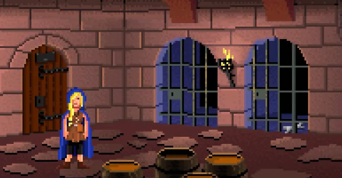 从右侧牢房拿起骨头,将其与决斗用的眼罩组合,得到缠着绷带的骨头。使用这个物品到打开的木桶上,使其浸泡朗姆酒,然后再用它去接触牢房之间的火把,获得一支可用的火把。 下楼。 用你的火把点燃沟渠,照亮房间。 在此处存档,以便在对话中获取一个容易错过的成就。 使用海螺四次来打破障碍物,并获得【HAVE YOU BEEN HURT?】成就。