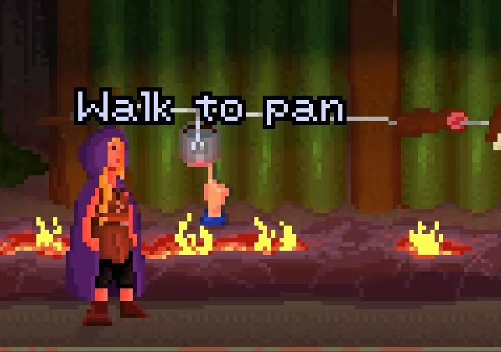 使用你刚刚发现的楼梯。 是时候收集一些东西了! 从种植盆中捡起萨满蘑菇,从同一张桌子右侧拿起 spatula 和氯气瓶,最后打开猫头鹰旁边的冰箱,从中偷走一罐菠萝。 回到外面,返回十字路口,走右下角的森林小路回到你的村庄。 和这里的裸体德鲁伊交谈,向他追问他的公文包和物品。 他会给你一个谜语,答案是他面前有多少个木制雕像指向你左边的树,眯起眼睛你就能看到那些小尖端朝向哪个方向。 正确回答三次就能打开他的物品栏,现在询问用一枚硬币能换什么,你会得到一个椰子。 走向右边的公共房屋。里面会有这个平底锅。