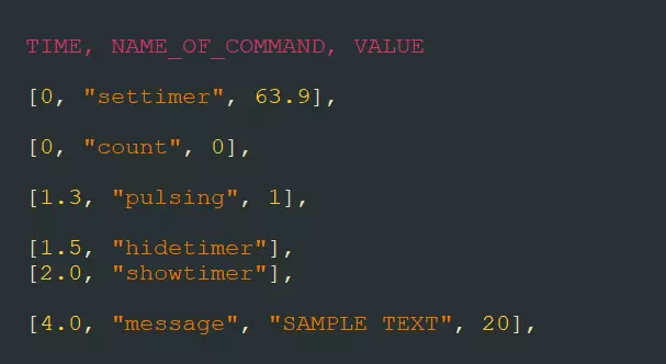 settimer命令可将游戏内计时器设置为特定数值。若数值为64.0,关卡将会结束。该命令不会立即更新计时器,而是会等待计时器自行更新。 count命令用于启动或停止游戏内计时器的更新。 pulsing命令可使屏幕产生脉动效果。 hidetimer和showtimer命令分别用于隐藏和显示计时器。 message命令可使消息显示在屏幕上,例如在此示例中,【SAMPLE TEXT】将显示20秒。