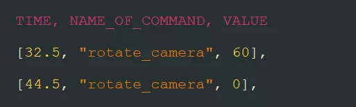 这是第一种形式。在此模式下,命令会按指定速度开始旋转相机,并且会持续旋转,直到你将速度设回0来停止它。 在这个示例中,相机将以每秒60度的速度旋转12秒。