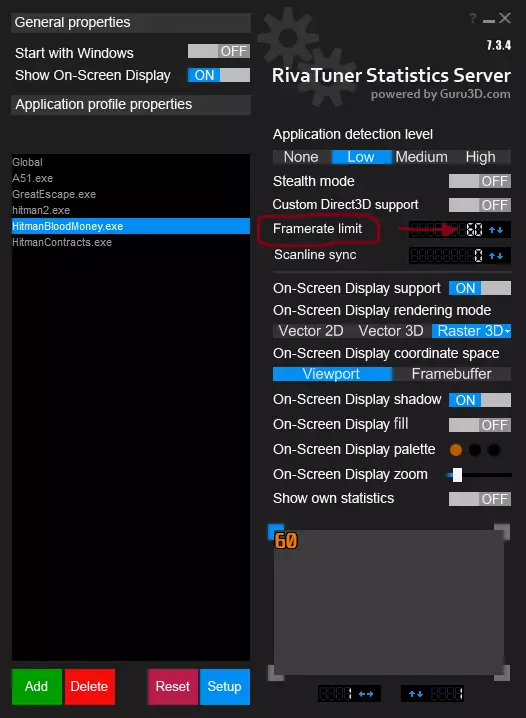在Rivatuner中选择HitmanBloodMoney.exe,并将帧率限制设置为60。