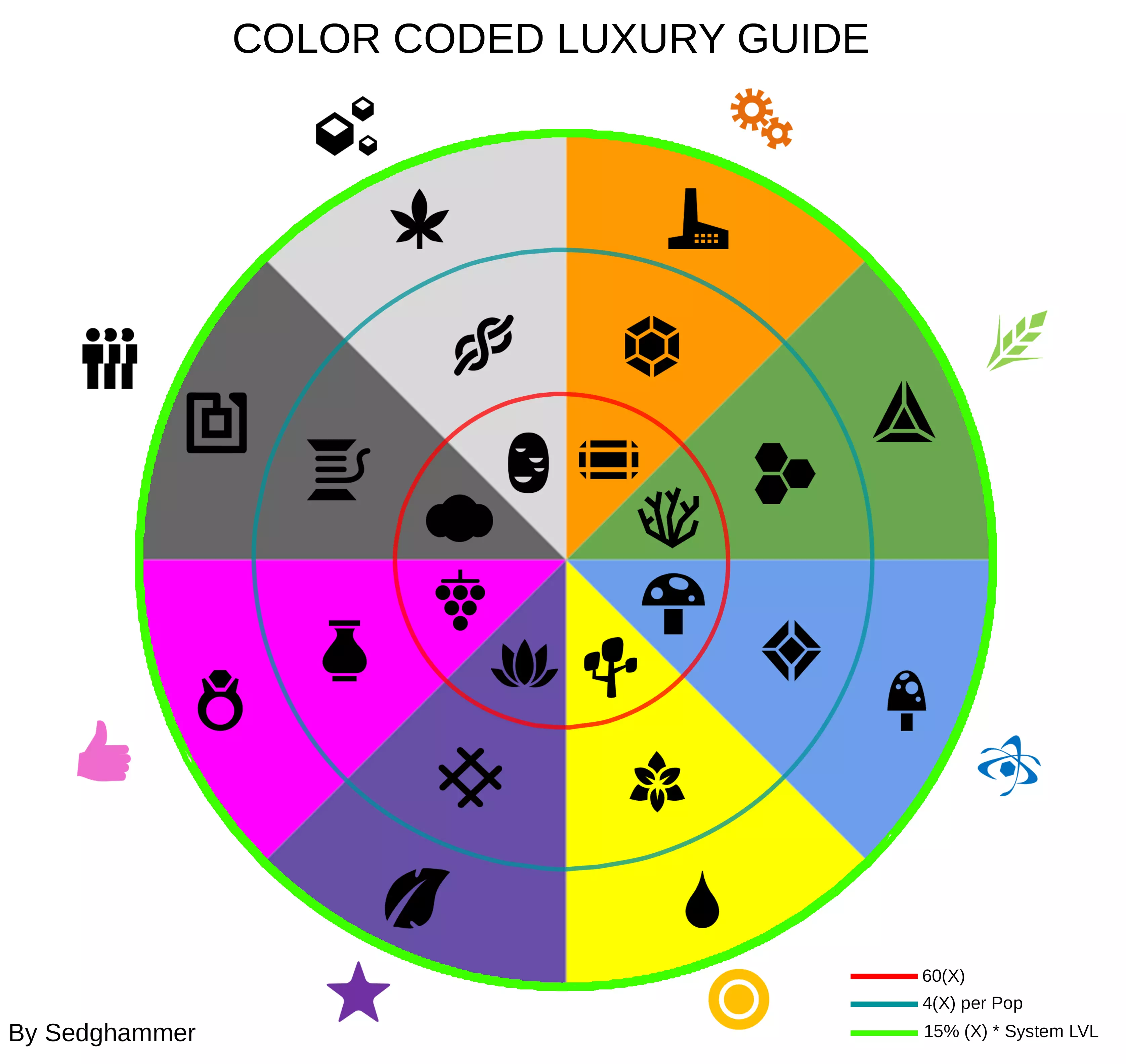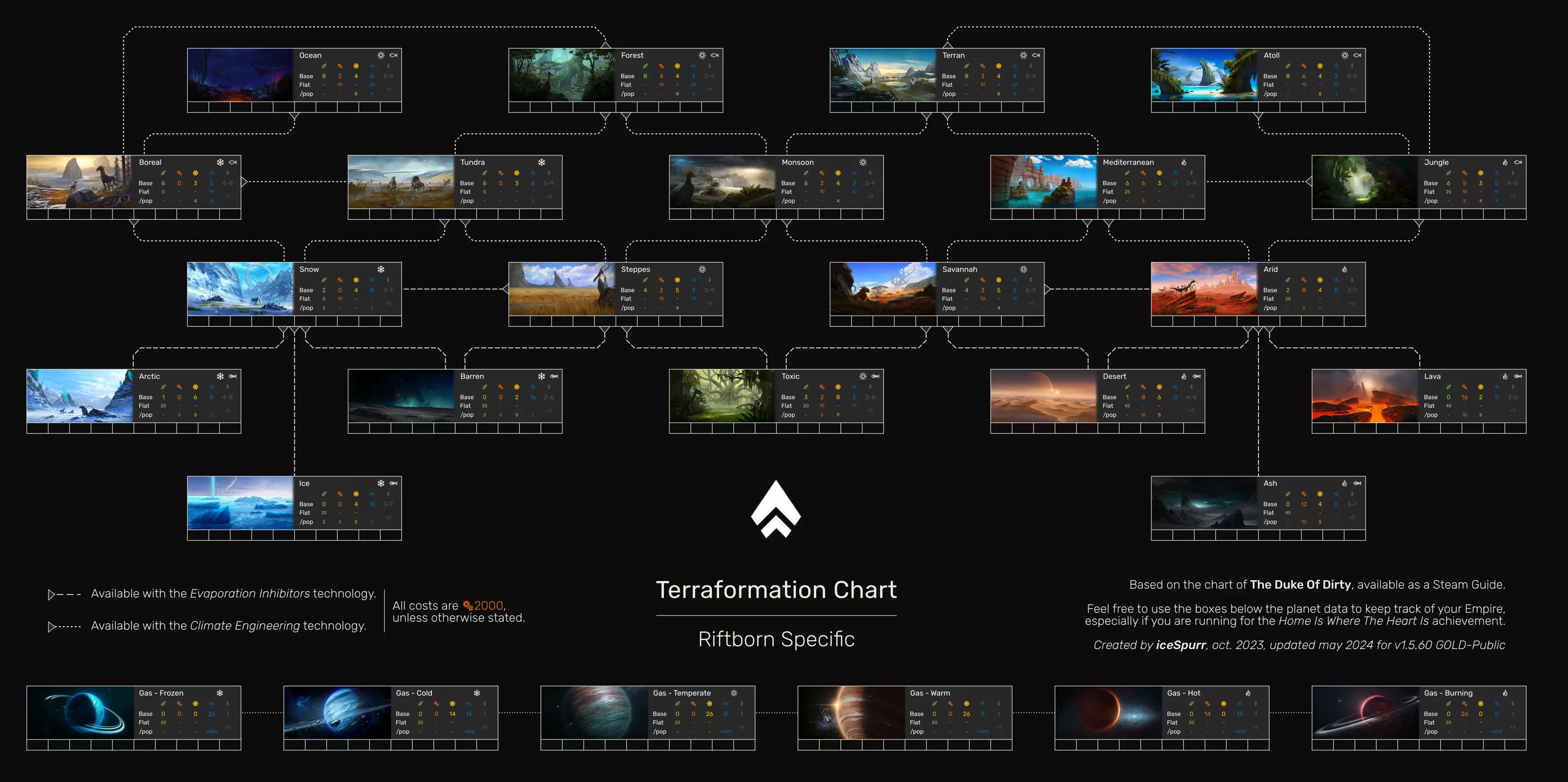 各位无尽玩家们,大家好! 我知道现在出这份指南有点晚了(毕竟这游戏都发布6年了),但我还是想分享一下我自己制作的地形改造图表。看过其他的图表后,我觉得它们在美观度和完整性上都有所欠缺,所以我自己制作了一份,今天分享给大家。 我想说明的是,我是在看到The Duke Of Dirty的图表(其指南链接在此)后,才有了制作这份图表的想法(包括组织方式和图表风格)。 这份图表中包含以下内容: 所有行星类型(这是当然的)及其在地形改造树中的关系。我已将气态巨行星纳入其中,但请记住它们无法进行地形改造。每种类型的统计数据:基础NIBS产量、固定加成和每人口加成,以及该星球可预期的人口槽数量(基础和加成后)。请注意,加成后的数值是在所有科技解锁且所有改良设施建造完成的情况下显示的。这不包括星球专精、独特改良设施、奇观或任务奖励。 该图表有两个版本:适用于所有派系的通用版本,以及裂隙族专属版本。你知道裂隙族拥有“反向”的地形改造树(如维基所述)。但事实并非完全如此:在反向树中,你可以将沙漠星球改造为熔岩星球;而如果你玩过裂隙族就会知道这是不可能的。所以我又制作了一张更准确的图表,供你下一局【裂隙族】游戏使用。通用版本: