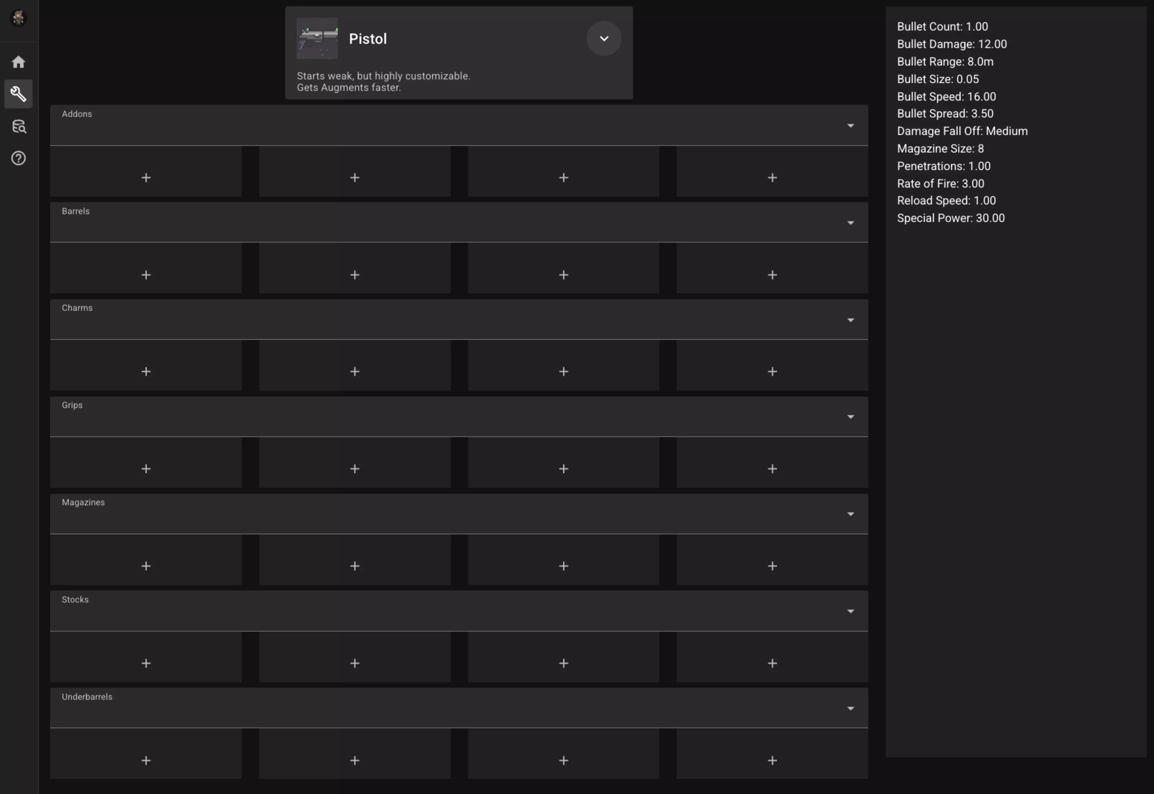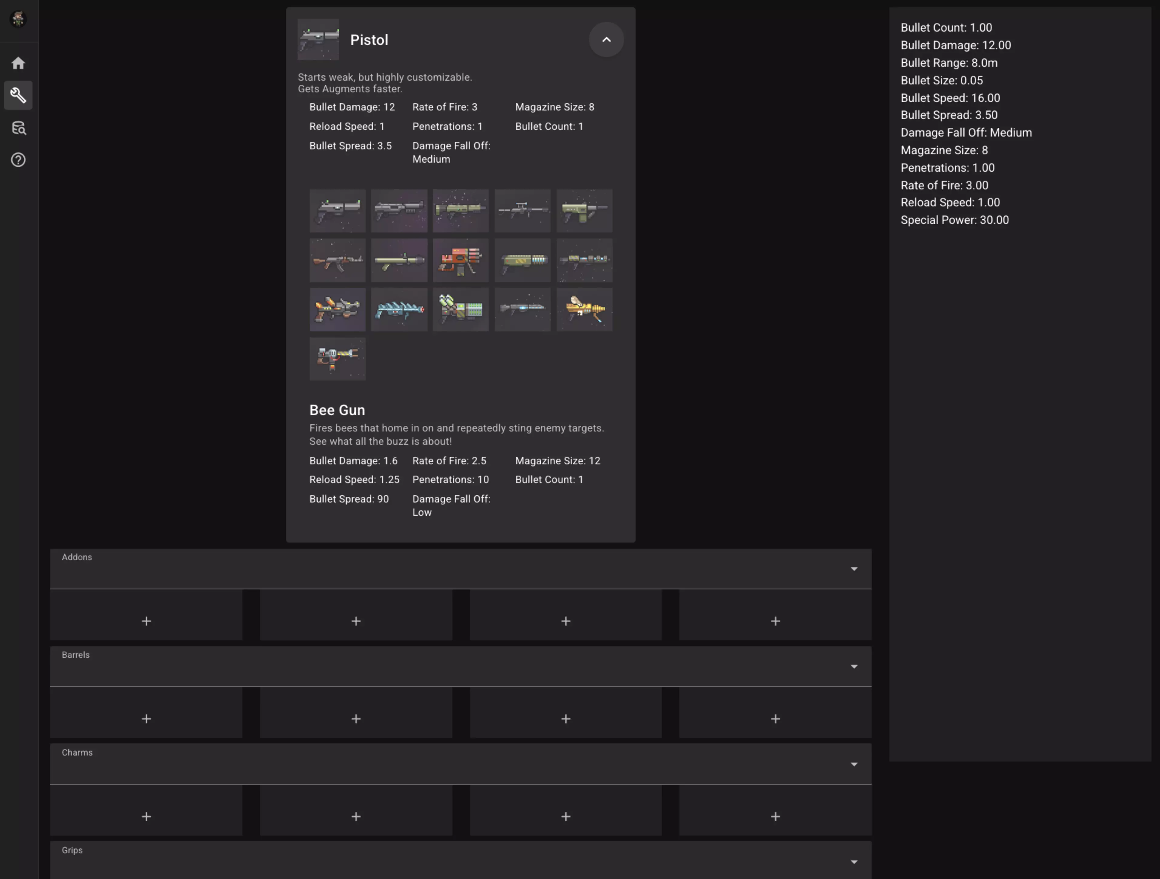 你也可以将鼠标悬停在某个效果上,查看该效果的描述,就像上方的火焰充能所示。 打造枪械 你可以通过此页面选择一个枪身以及你想安装在该枪身上的强化部件,并查看该组合的最终效果。 (如果你已加载存档文件,那么每个已购买的强化部件名称后都会显示一个对勾标记。) 打开该页面时,默认选中的是手枪。