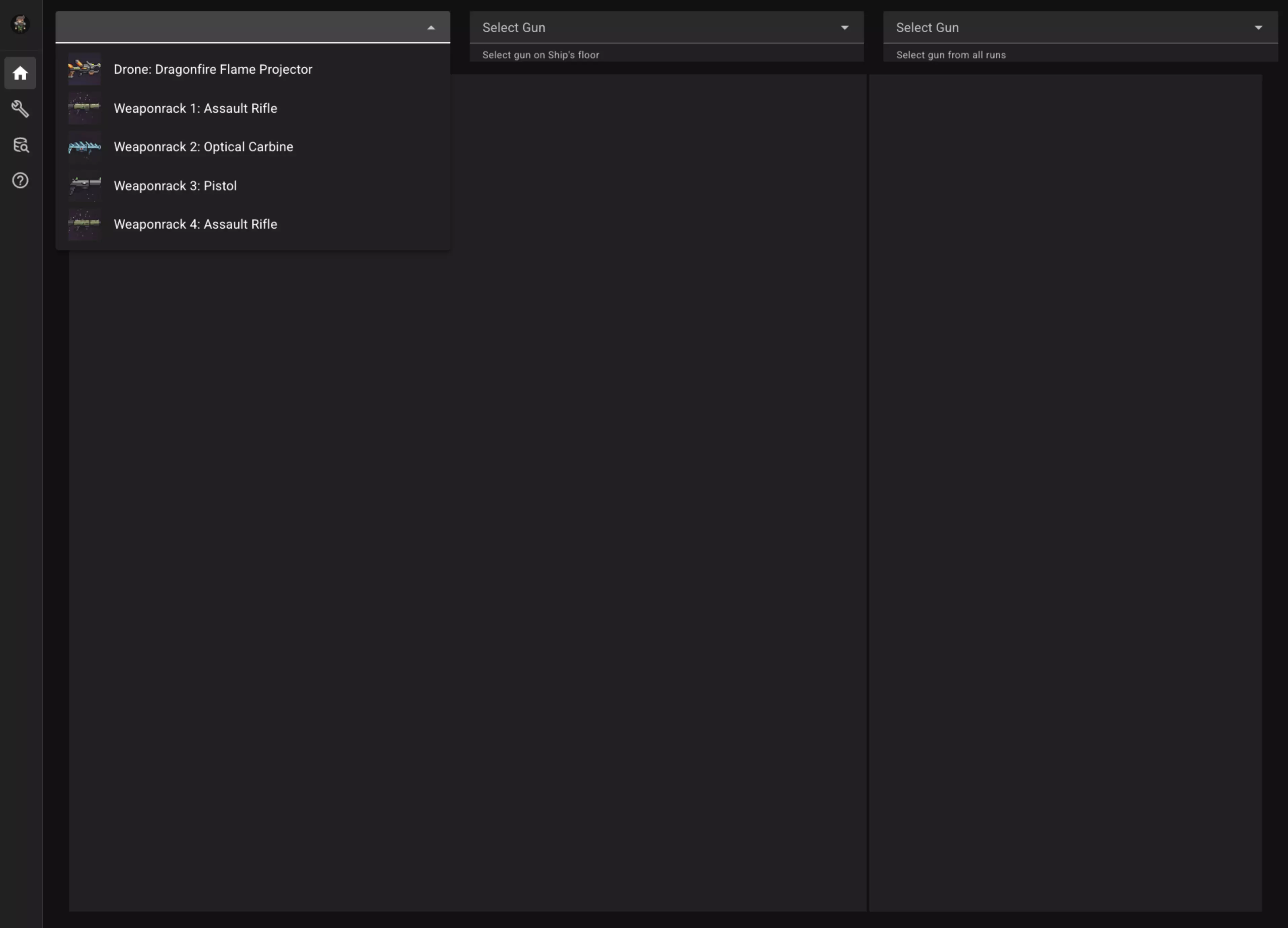 显示你已打造枪械的时间线 使用本页面前,你必须已加载存档文件。 在【展示你的枪械】页面,你可以选择一把已打造的枪械,查看添加各项强化、调校和战利品的时间线,以及每项内容对枪械产生的效果。 为方便使用,设有3个下拉菜单供你选择枪械:一个用于选择放置在无人机或武器架上的枪械,一个用于选择散落在飞船地板上的枪械,还有一个用于选择你曾打造过的所有枪械。 首先,从其中一个下拉菜单中选择一把枪械:
