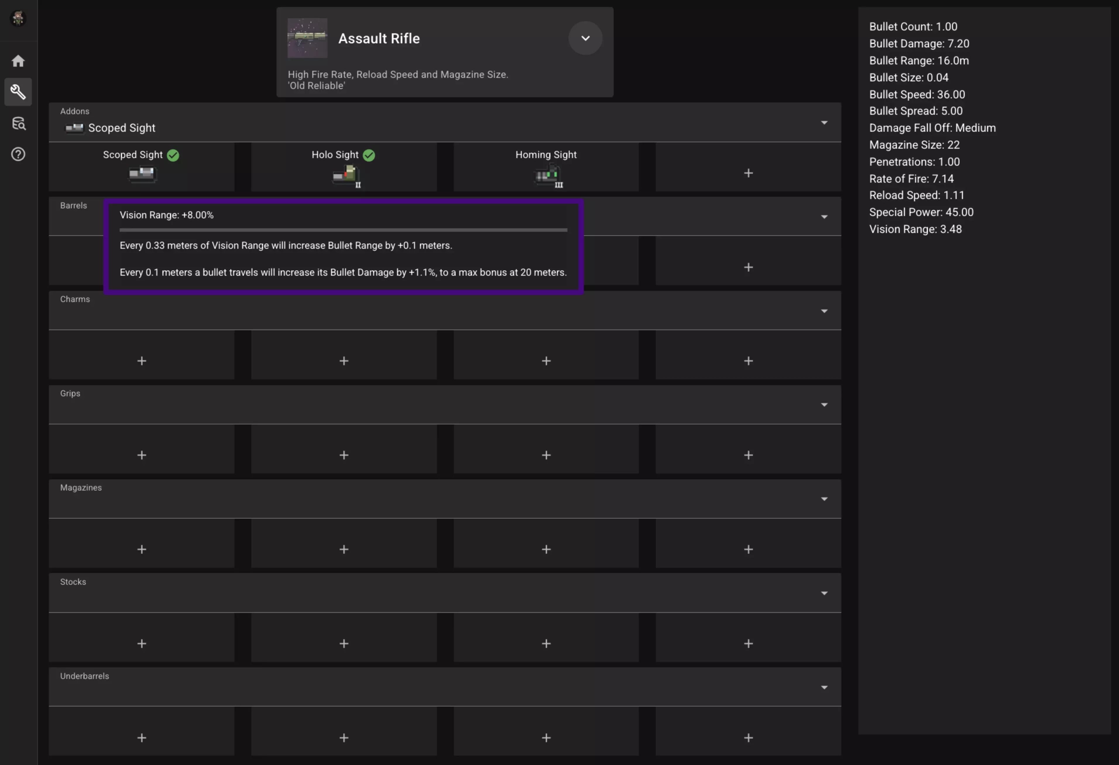 点击你想要的该强化的最终等级,选择将关闭并显示已选强化。(如果在已选择强化的情况下将鼠标悬停在物品栏位上,会弹出显示该物品属性和描述的窗口。如下方图片中全息瞄准镜所示。)