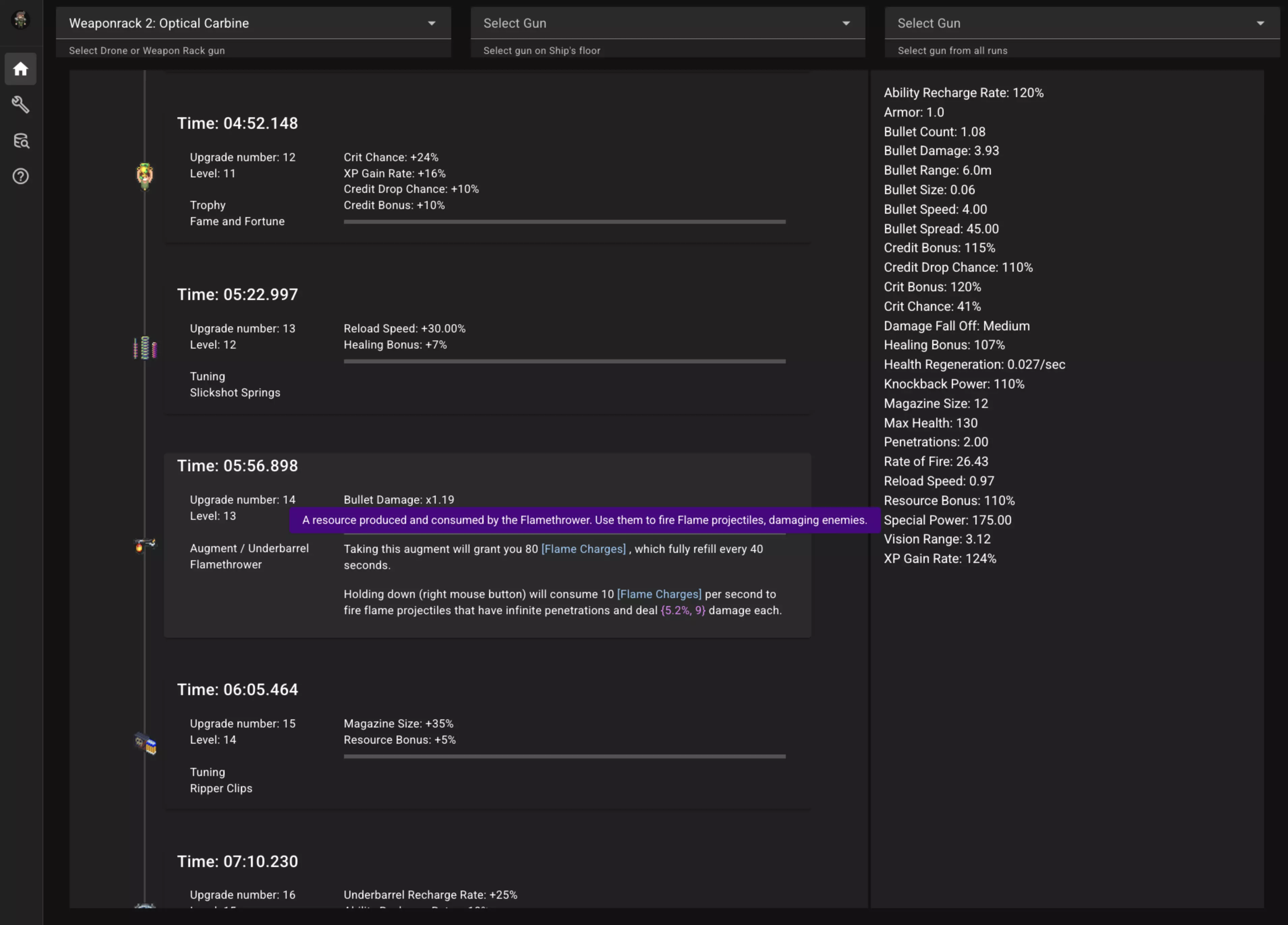 你可以向下滚动列表,点击某个项目后,属性将重新计算以显示该特定时间的属性值。 如果某个强化/调校/战利品的属性依赖于特殊能力,那么时间线中的对应数值也会更新。 例如,在下图中,我点击了枪上添加火焰喷射器下挂的时间点。右侧的属性已重新计算,以显示当时枪械的状态,而描述每条火焰弹伤害的文字也根据该特定时间的枪械特殊能力进行了更新(同时还会显示该强化所使用的特殊能力百分比)。在这个例子中,特殊能力为175.00,其中的5.2%就是9。