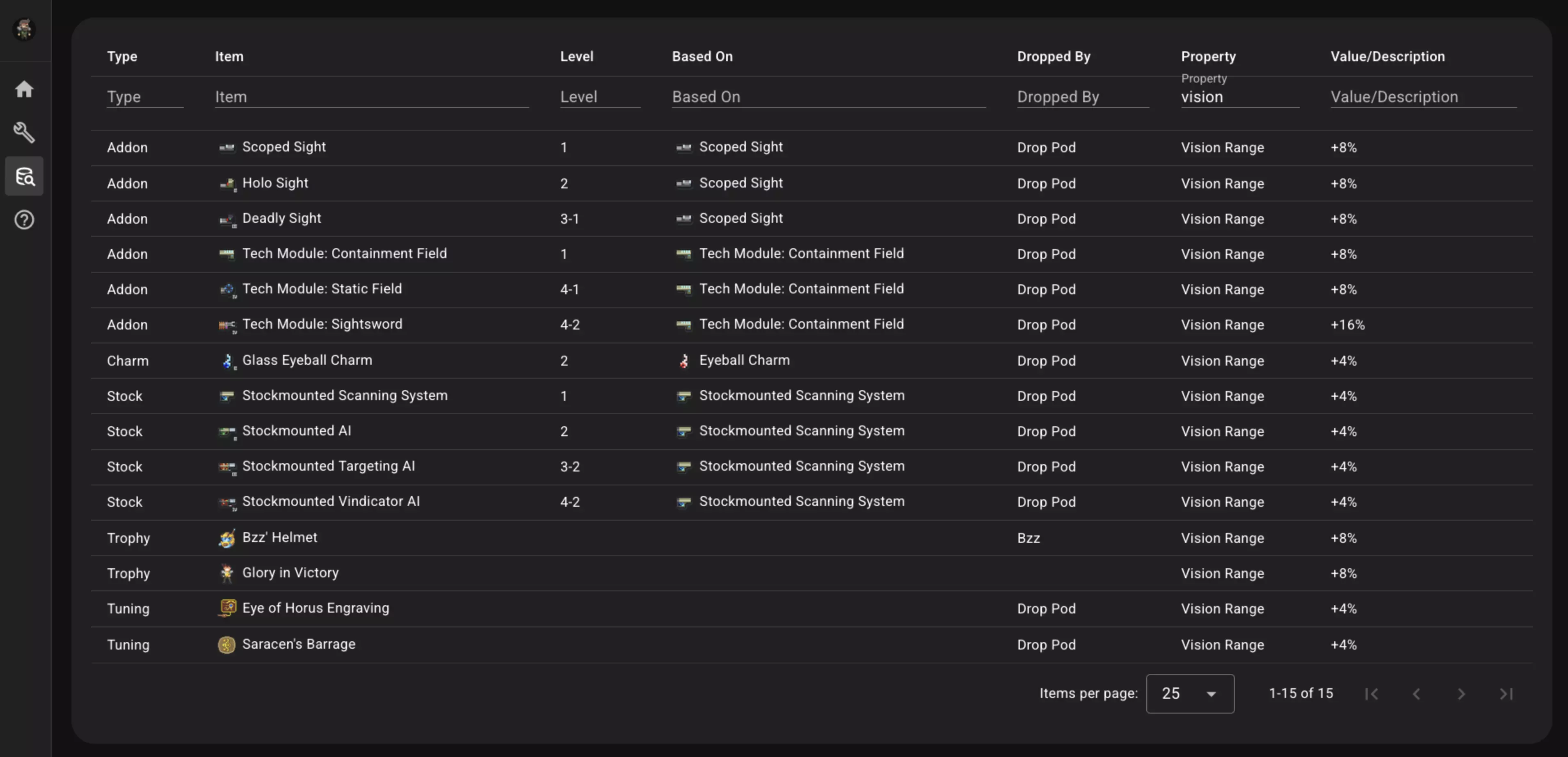 只需在每个字段中输入你想要搜索的全部或部分文本,页面就会随着你的输入实时更新。在下方图片中,我想查看所有对【视野范围】有影响的物品。因此,我在【属性】列中输入了“vision”,页面随即显示出所有影响该属性的物品。