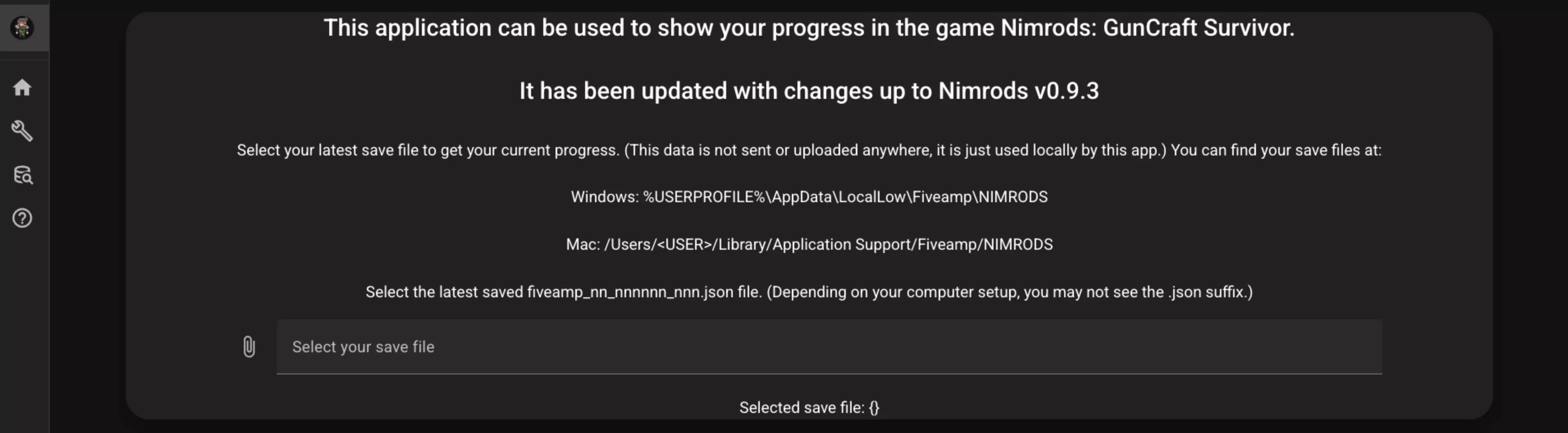 Nimrods Investigator 以下是该应用程序的功能: - 针对你在《NIMRODS: 枪匠幸存者》中创建的每把枪,展示其所有强化、调校和战利品的时间线。点击添加强化、调校或战利品的时间点,即可查看当时枪械的属性。 - 自定义枪械强化,预览该配置下枪械的属性。 - 显示所有强化、调校和战利品的列表,包含它们的属性和描述。该列表可进行筛选,例如显示所有影响子弹速度、弹匣容量或其他属性的物品。或者,你可以在描述栏中搜索“冲击波”来查找能产生冲击波的物品。如果你有特定的build思路,这可以用来找到你可能想添加到枪械上的物品。 - 显示仅在特定条件下才会出现的特殊改装列表。 加载你的存档文件(仅部分功能需要) 如果你想使用该应用显示你在游戏中打造的枪械,需要将存档文件加载到应用中。存档文件不会被发送或上传到任何地方,仅在本地供应用使用。如果你想在建造枪页面上看到已购买且可在游戏中使用的强化项旁显示对勾标记,这也是必要的。 要加载你的存档文件,只需点击“选择你的存档文件”框并选择你最新的存档文件。