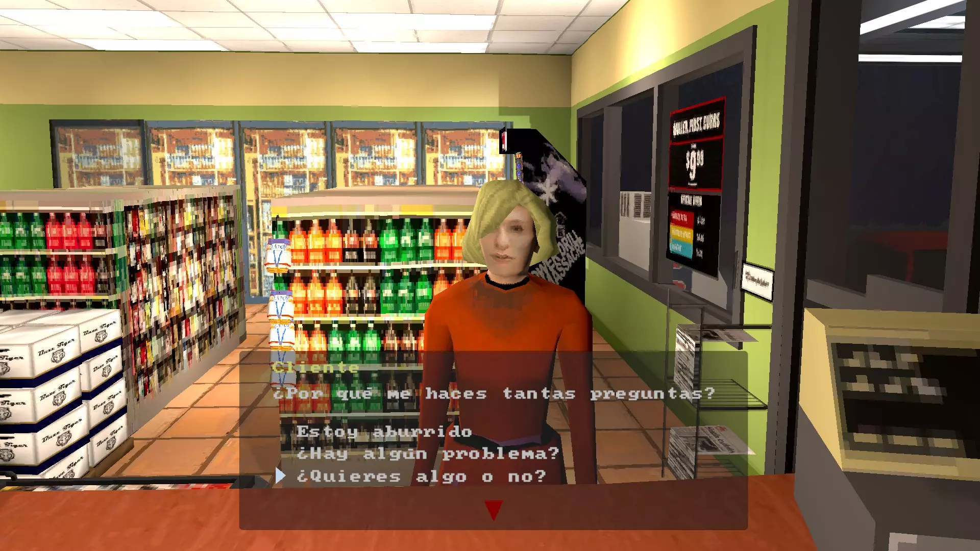 这是游戏中“糟糕的客户服务”成就的获取攻略,在夜班场景里,等金发女顾客到来后,和她互动时选择特定对话选项,会让她生气离开,以此完成该成就。