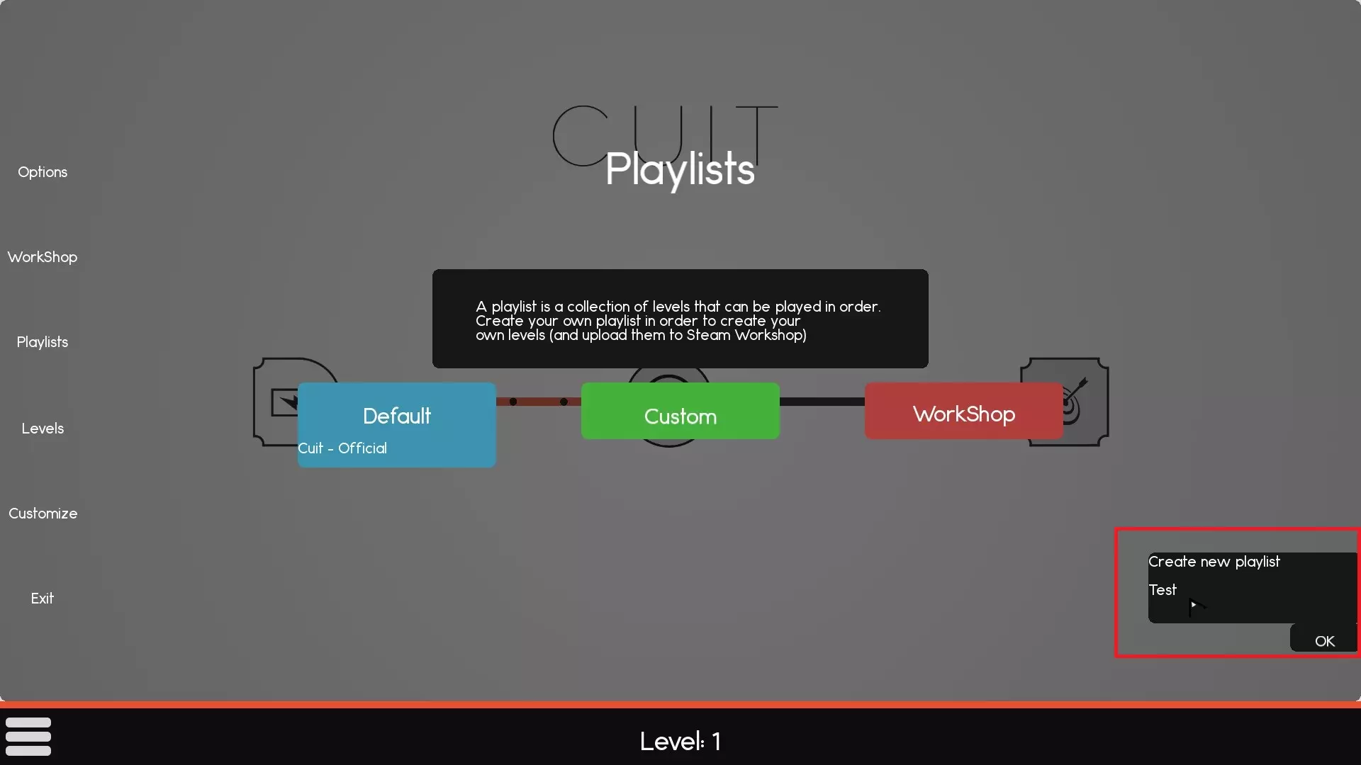 富有野心:创建你自己的关卡。 ✦ 点击菜单中的【创意工坊】,然后上传(无需填写字段)。 ✦ 你将向创意工坊上传一个空的播放列表,建议之后将其删除或隐藏。