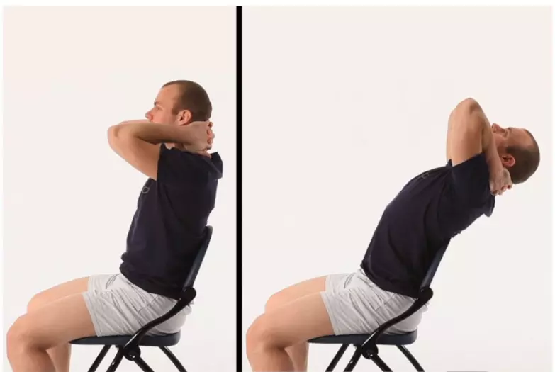背部拉伸 如果您身体前倾或后仰,背部可能会非常疲劳。坐姿背部拉伸可以帮助缓解紧张感,打开胸部和肩膀。 做法:在椅子上向后靠,背部舒适地靠在椅背上。将手掌放在后脑勺上。身体向后倾斜,借助椅背的支撑,同时保持肘部张开,直到感觉到整个背部和胸部有轻微的拉伸感。保持这个姿势10-15秒。