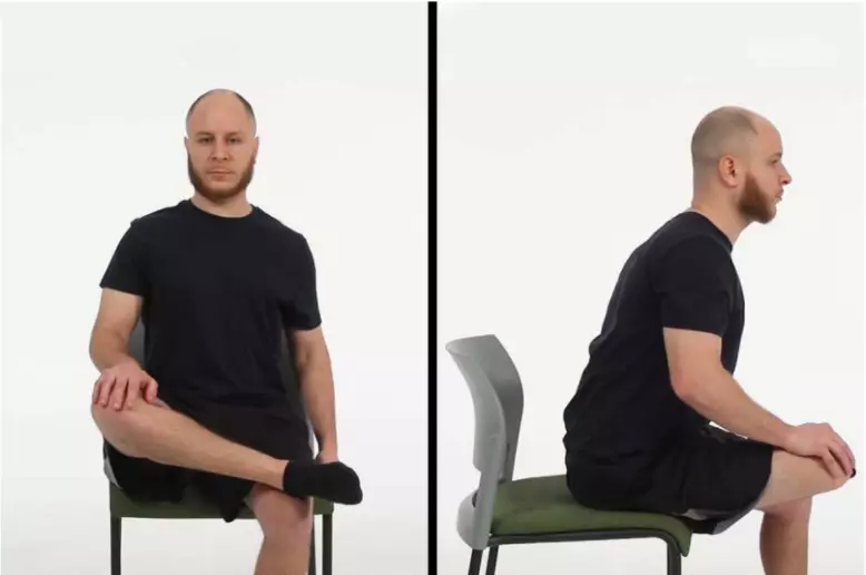 大腿拉伸 长时间坐着后,下半身可能会感到非常紧张。坐着时,大腿肌肉会出现收缩和紧张的情况,臀部也会被拉伸。这个简单的练习旨在同时拉伸大腿和臀部的所有区域。 做法:坐着,将右脚踝交叉放在左膝上。坐直身体,从髋部开始向前倾斜,直到感觉到右臀部有拉伸感。您可以按压右膝来加深拉伸。保持这个姿势15-30秒,然后换另一侧重复。