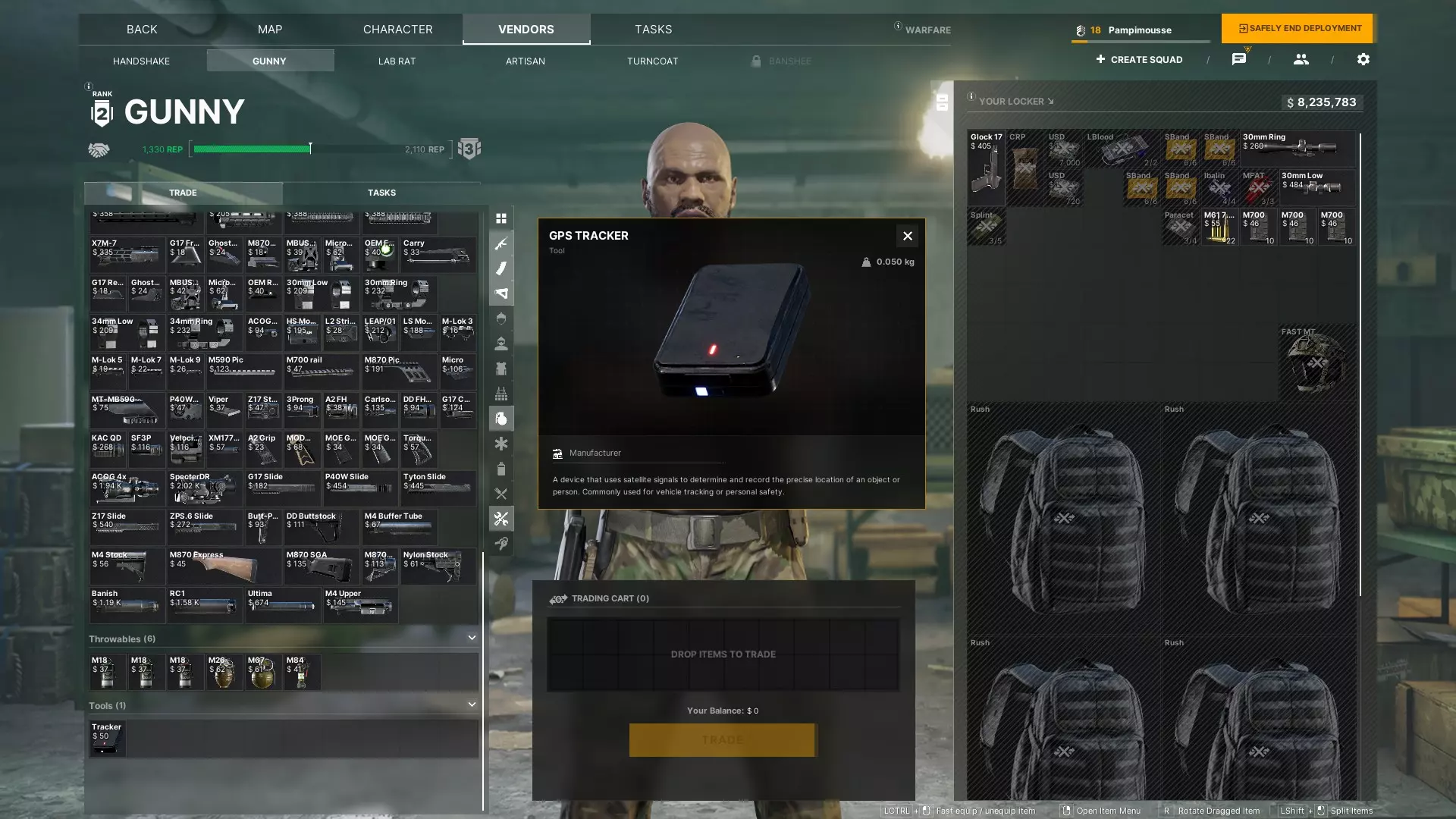 本维基是详细介绍《灰色地带战争》众多任务的平台。它已被翻译成法语并进行了详细说明,旨在帮助密特拉安全系统阵营的玩家完成任务并提升商人等级。 本维基将定期更新! 如果您了解到游戏及其任务的任何修改内容尚未收录到本维基中,请通过Discord联系“Pampimousse”(如果找不到Pampimousse,可以尝试搜索“Pampimousse#0001”)。 至于我们的Steam指南可能涉及的其他内容,我们将根据您对本指南的反馈来决定。如果大家觉得这份指南有用且能帮助到很多人,我们会考虑对其进行完善,并补充游戏的背景故事相关信息。 【缓存取回】 ⚠️注意⚠️ 此任务需要追踪器。如果没有或已用完,前往冈尼的商店 -> 下拉至最底部即可找到追踪器。 *追踪器图片见下方* 对于冈尼商人的这个任务,你需要找到: *仓库 *帕朗锯木厂或木材场