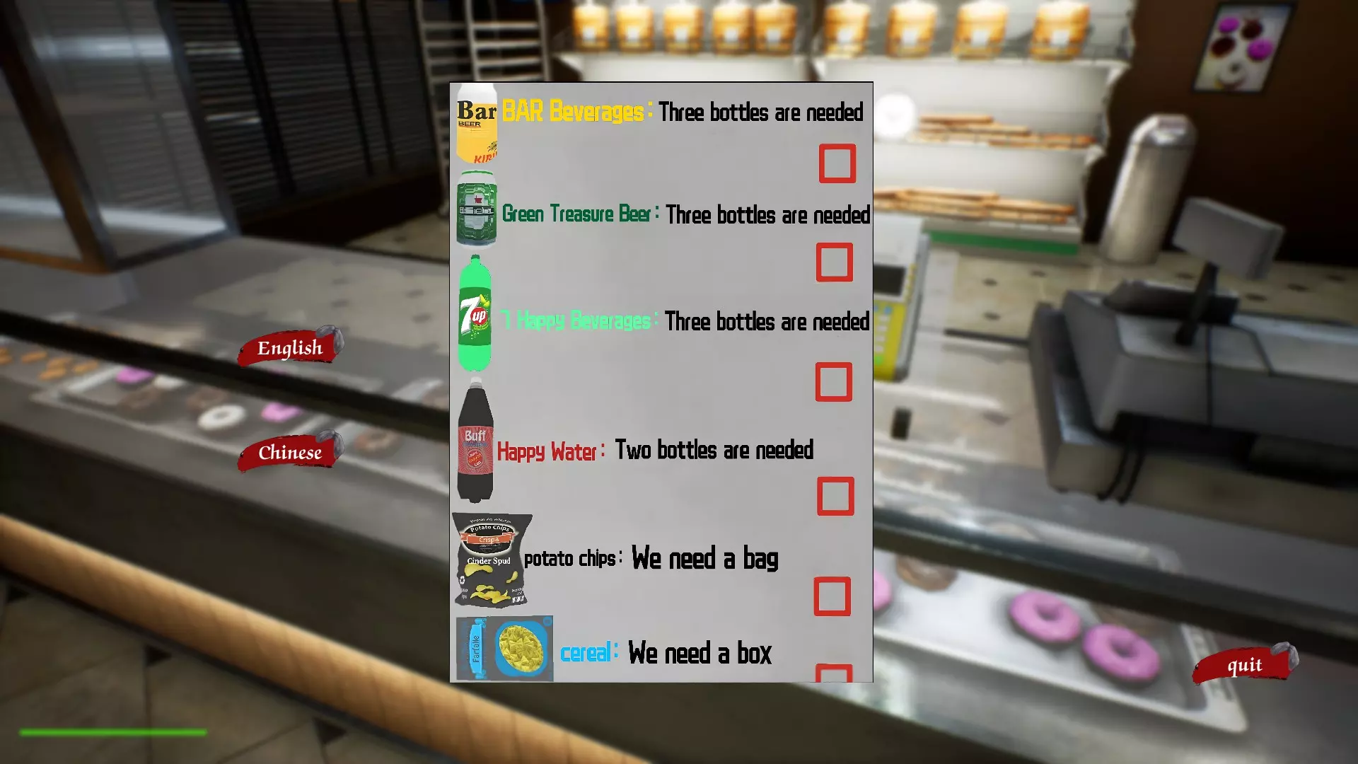 所有所需物品可在0号、1号和2号货架找到。前三种饮料在0号货架旁的冰箱里。快乐水在0号货架。薯片在2号货架。麦片在1号货架。