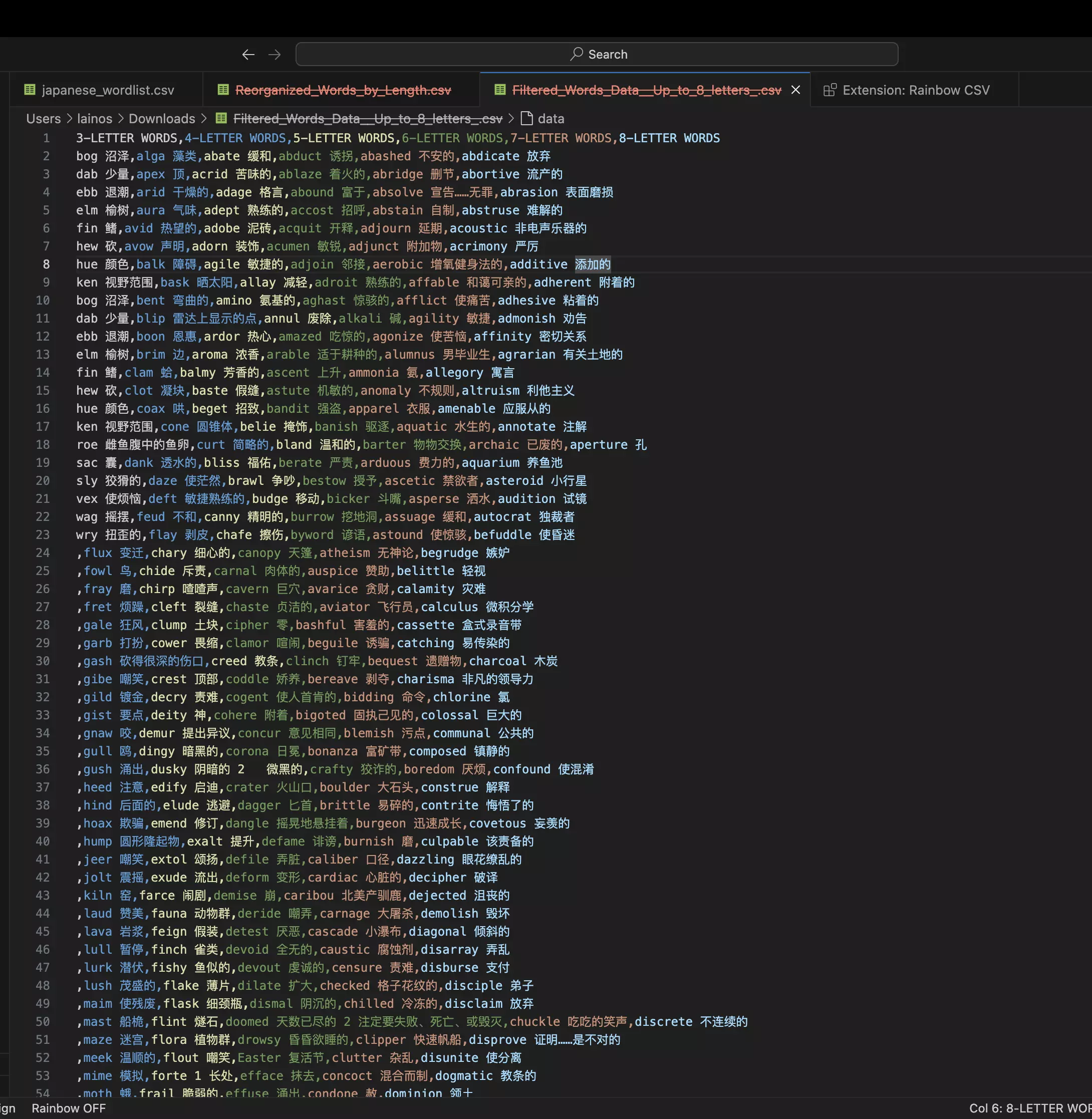 教程 利用日语的显示功能,修改词汇表以双语对照的方式学习词汇。 1.按F9打开控制台 2.输入info csv japanese 3.然后编辑控制台中显示路径下的japanese_wordlist.csv 4.修改成你想要的双语对照词汇表(可使用AI帮助制作单词表),但目前由于游戏限制,不能使用8个字母以上的词汇。