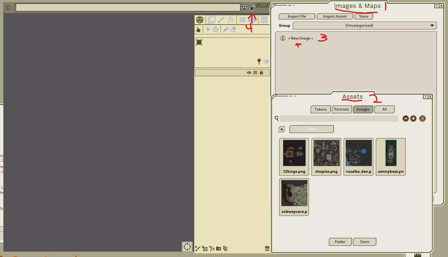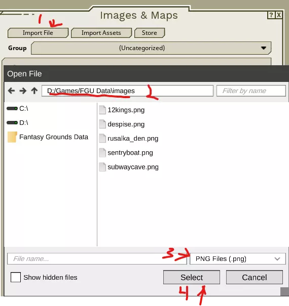 替代方法 你可以直接将任意位置(甚至FGU文件夹)的图片导入【图像和地图】窗口。执行此操作时,该图片不能是已导入的,否则会创建重复项并导致错误消息。请注意,FGU仅支持.png和.jpg格式的文件。