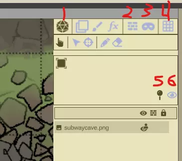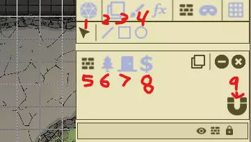 顶部栏(1-4)是模式选择区域。 1:游玩模式 2:墙壁与视线(LOS) 3:遮罩(此为FGC中的遮罩功能,本教程暂不使用) 4:网格选项 标有5和6的部分用于【游玩】模式。 5:固定可见性切换 6:视线可见性切换(用于开启或关闭视线,非常重要) 首先我们来设置地图网格,这是处理任何地图时的首要步骤。设置好网格后,点击【墙壁】模式(2)按钮。