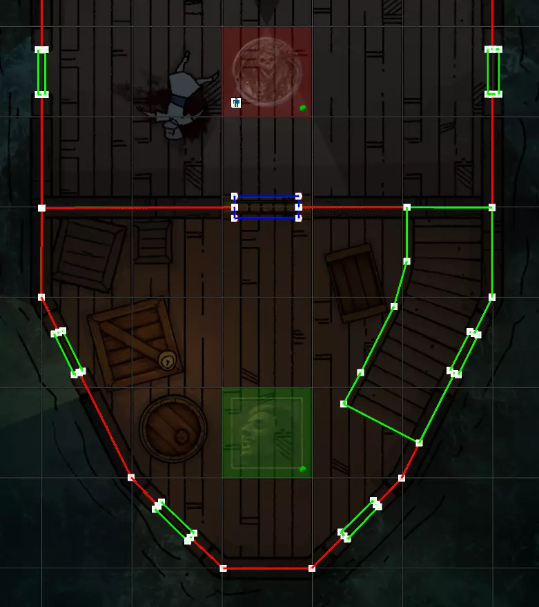 以下是工具功能: 1. 选择 2. 绘制线条(注:用于门和地形时,此功能作为多边形绘制工具) 3. 绘制方框 4. 绘制圆形 视线类型选择 5. 墙壁(无法穿过或透视) 6. 地形(可以穿过,能看到绘制区域,但无法看到绘制区域之外,玩家无法切换,且若有标记物位于地形中,可看到地形外所有区域) 7. 门(可略微透视,能看到绘制区域,关闭时无法穿过,但玩家可切换其状态(除非已锁定)) 8. 外观类似墙壁,但地下城主可将其开启以允许玩家穿过 最后要介绍的工具是(9)吸附工具。该工具可将墙壁线条吸附在一起,通常建议保持开启状态。创建和查看视线 开始绘制地图吧。通常,最好每次只使用一种绘制模式。我个人喜欢先绘制门,然后是墙壁,接着是地形和秘密门。不过,绘制顺序完全由你决定。要绘制线条,点击线条工具,然后在地图上点击各个点。如果需要暂停绘制线条,按Esc键结束绘制。 需要注意的几点: - 可以使用方向键在地图上移动 - 绘制墙壁时保持一致性是个好主意 - 绘制墙壁时,最好能让部分墙壁的美术效果可见 - 要退出绘制工具(尤其是线条工具),按Esc键 - 通常来说,门的方框最好比其图像本身大一些确保门内有一小段墙壁,以防止看到门后的区域。 双击节点可以选中整条已绘制的线条或多边形。 选中节点后按删除键可删除一个或多个节点。 让一条线与另一条线交叉会创建一个节点。 你可以切换到游玩模式,使用玩家角色或非玩家角色测试视野,选中它们即可查看视野效果。 以下是绘制墙壁的示例:蓝色方块是门,绿色线条是地形,红色线条是墙壁。此图片处于非游玩模式下。