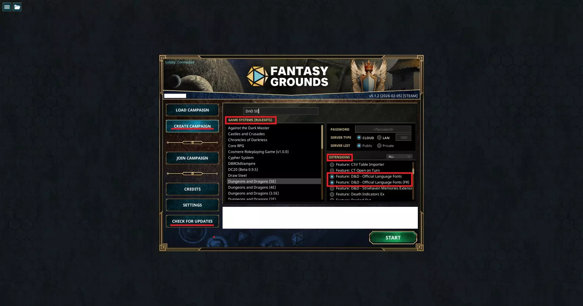 如果你刚下载了规则集、模块或扩展,只需在启动器中更新一次,它就能识别这些新内容。但如果开发者更新了软件,我不建议在重要的游戏会话前进行更新,以防模块出现问题。 操作步骤如下: 1. 点击创建战役 2. 选择你的规则集 3. 勾选扩展中的标记 4. 为其命名(我这里命名为【龙与地下城5版】) 5. 这样就可以开始了 当你从The Forge下载内容时,它会自动复制文件。之后你只需进行更新即可。 以下是可以免费进行的操作: 你可以进行单人游戏来熟悉设定或练习游戏主持技能,或者只是为了自娱自乐。尽情尝试吧!你可以与朋友联机,为他们运行我列出的一些免费快速遭遇战或一次性冒险。你可以在相关社区和论坛中找到其他玩家一起游戏,因为现在担任游戏管理员不再需要终极许可证了。正如极客玩家曾说过的“准备即是游戏”,你可以在虚拟桌面平台中构建自己的自定义冒险世界,既可以是带有链接的文本形式,也可以添加免费图片和地图。你可以将地图作为起点,在此基础上进行扩展,还能在地图上添加标记。如果你对其他规则集感兴趣,Fantasy Grounds虚拟桌面平台也支持大多数热门小众规则,但就免费使用而言,它们需要投入最多的工作。混乱始于学生们接到一位自称“白女巫”的朋友兼同学的紧急电话。他们需要帮她“获取”一些简单物品,然后协助她进行一场仪式,以阻止一场灾难。 本冒险专为新生(新手等级角色)设计,包含几个进阶内容。他们可能知道也可能不知道超自然现象是真实存在的,但在这个故事结束后,他们肯定会明白。 * 《死亡之地:重装上阵》(已转换):单页(增强版)圣诞零点行动:在《死亡之地:人间地狱》的当前时间线中,现在是平安夜。普赖尔一家决定前往当地集市享受圣诞乐趣。此刻集市正值傍晚时分。商人正在讨价还价,当地教堂供应着热巧克力,甚至还有唱颂歌的人! 但就在这时……警车呼啸而过,警笛声大作。收音机里传来声音:“……在城镇边缘检测到未爆炸的幽灵石炸弹……”喇叭声、人们的喊叫声响起,然后突然一切都安静了…… 暗影黑暗 * 遗忘之墓:在森林墓地深处,玩家们发现了一座陵墓,里面藏着一个布满不死生物的地穴、致命的埋伏,以及一个与古老贵族血脉相关的谜题。专为【暗影黑暗】重新设计,这个包含三场遭遇战的地下城单局冒险带有经典风格,是一级角色的完美初始冒险,也可作为支线任务或大型战役弧的一部分,融入任何现有【暗影黑暗】战役中,适合最高三级的角色。 对于D&D老手: 显然,就免费资源而言,【龙与地下城5E】占据最大份额。我将只列出FGVTT模块。 将.mod文件复制到data > modules文件夹后,从启动器更新客户端。 免费【龙与地下城5E】冒险: 这些冒险均为单局或两局,通常需要2-4小时进行。 德兰尼的第十季地下城工艺冒险三部曲 合集冰封之路:前往伊斯塔文 队伍受雇担任护卫,负责保护一支商队从世界之脊前往伊斯塔文。 2. 恐惧的冰冷之眼 与一名疯狂的 kobold(狗头人)的遭遇,将冒险者们引入隐藏在黑暗洞穴中的深层谜团。冒险者们能否解开线索,弄清等待他们的是何种恐怖? 3. 春日最后的避难所 伊斯塔文城内流传着一则消息,请求勇敢的冒险者前往世界之脊执行救援任务。消息内容如下: 招募冒险者执行救援任务。罗格·德兰尼安带领的小队在雷吉德冰川附近失踪。德兰尼斯·安特奥斯正在寻找足够勇敢的冒险者组建探险队,以找到该小队并将他们带回伊斯塔文。如果你感兴趣,请于双日上午10点在白女士酒馆会面。你的时间将获得报酬。 扎达克的冰封金字形神塔系列 此捆绑包用于捐款。4个独立模块中有2个为随你定价。 1. 奥里尔的信仰 欢迎来到冰风谷。 勇敢地踏入这片被黑暗笼罩的土地,直面邪恶神明。 2. 伊吉的蠢事 夏达林的恶作剧。 寻找无畏的冒险家伊吉·斯努兹纽斯,揭开冰风谷各地夏达林矿脉形成增多背后的谜团。Jade Breed 的《扭曲》 注意:目前暂无计划为该模组更新 Fantasy Grounds Unity 光照系统。 一个时间旅行沙盒战役。 《哀嚎洞穴》 独眼矮人商人玛格丹雇佣你的队伍保护他,他将借助一枚魔法戒指追踪他的信使。目的地是一个洞穴,只能通过攀爬一座名为“黑暗空洞”的荒凉山顶上的崎岖斜坡才能到达。 JD McComb 的 MOR 系列 目前暂无捆绑包。内容略带黑暗风格。提示:妖精荒野。 1. 《莫尔迪尼亚的枯萎病》 内容警告:离体器官、自然失衡、密码学冒险家们必须从一个精野领域中营救一名被绑架的吟游诗人。队伍能否破译线索追踪到吟游诗人,并解开莫尔迪尼亚的神秘枯萎病之谜? 2. 陵墓的黑暗瘴气 内容警告:污染、不死生物、溺水、鬼魂、骷髅、离体器官。 关于死灵法师努尔杜尔的传说中的黑暗陵墓,一直流传着各种传说。这座陵墓已被时间的流沙所掩埋。如今,陵墓位置的线索浮出水面,冒险家们正沿着一条通往精野的道路前行。 【新增!】更多龙与地下城5版好内容 地下城主的龙与地下城5版常见问题解答你是否在使用Fantasy Grounds进行龙与地下城5版的主持或游玩时,反复遇到相同的问题?拥有一份包含答案并链接至Fantasy Grounds龙与地下城玩家手册豪华版以获取更多信息的常见问题列表是否会有所帮助?那么,本产品正是为此而生!这仅是一个Fantasy Grounds模块文件。希望它能帮到你。祝你游戏愉快。 新亚种 沃洛的完整亚种手册 沃洛的完整亚种手册包含了