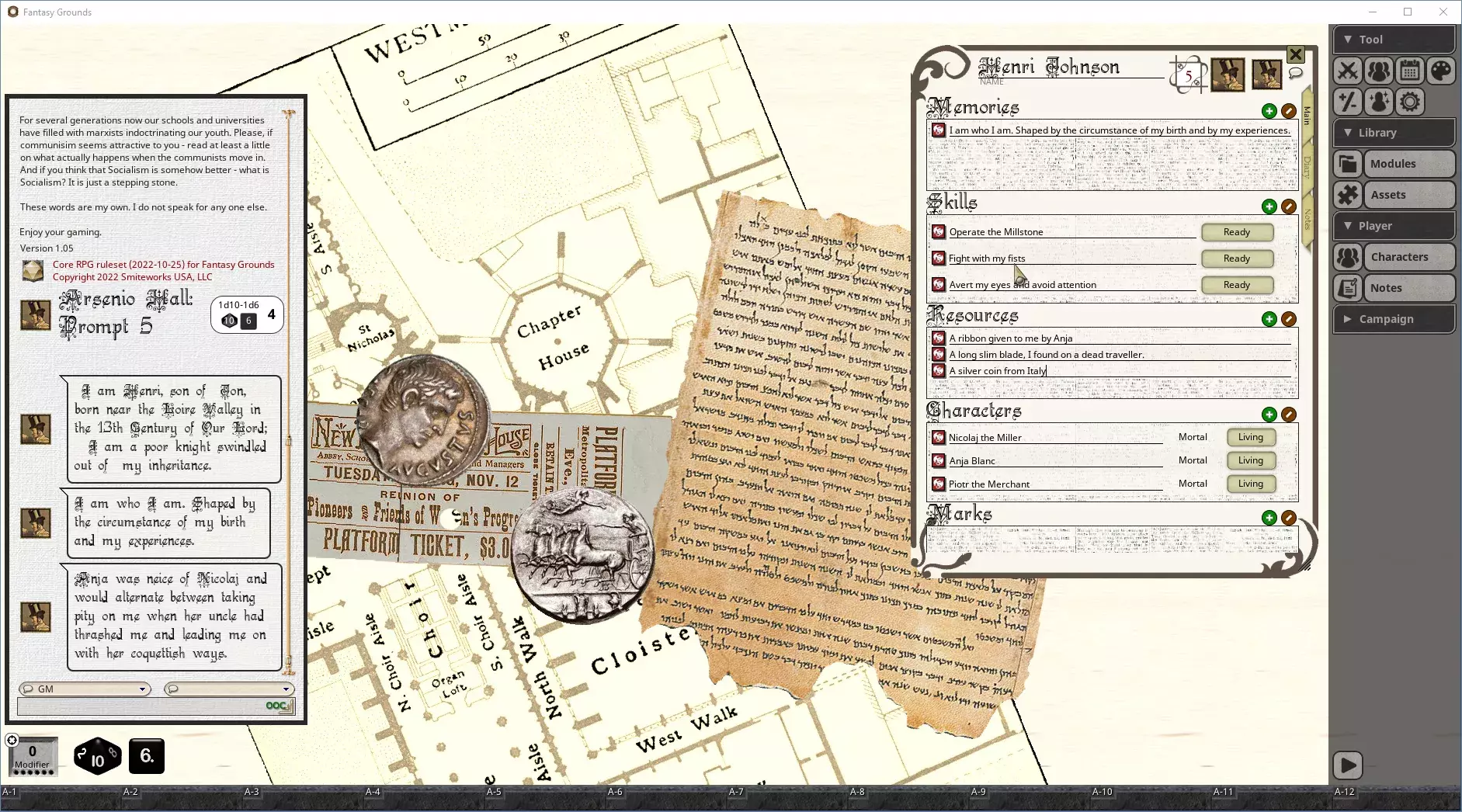 Decked Out是一款适用于任何基于CoreRPG规则集的扩展,它添加了一个全面且直观的系统,用于在任何游戏中处理卡牌组。使用代币作为卡牌图像创建卡牌组,然后加载该卡牌组并发牌。所有操作都可以通过无缝拖放或径向菜单进行处理。支持基本的卡牌操作:发牌、出牌、弃牌和给牌。每个卡牌组都可以配置为在移动时显示或隐藏卡牌。 该扩展随附一个模块,其中包含标准的52张卡牌组以及2张百搭牌。尼古拉斯·卡弗纳斯的《基础设定》- 免费PDF规则 现在,借助Decked Out和FGVTT的战役笔记功能,你可以使用以下免费规则手册,基于卡牌来创建你的世界: 其核心玩法是为卡牌的花色和点数赋予特定含义,然后将它们用作随机内容生成器,来构建幻想世界的各个部分。 更多信息:《基础设定》是一款单人世界构建与地图绘制游戏,旨在帮助玩家为桌面角色扮演游戏和故事创作幻想设定。它融合了地理学、历史学和人类学的现实世界概念以及幻想元素的简化表达,帮助玩家创造出完整、引人入胜且独一无二的世界。该游戏既可以作为世界构建练习,也可以作为独立游戏进行体验。该内容包含外部链接,已按规则处理。