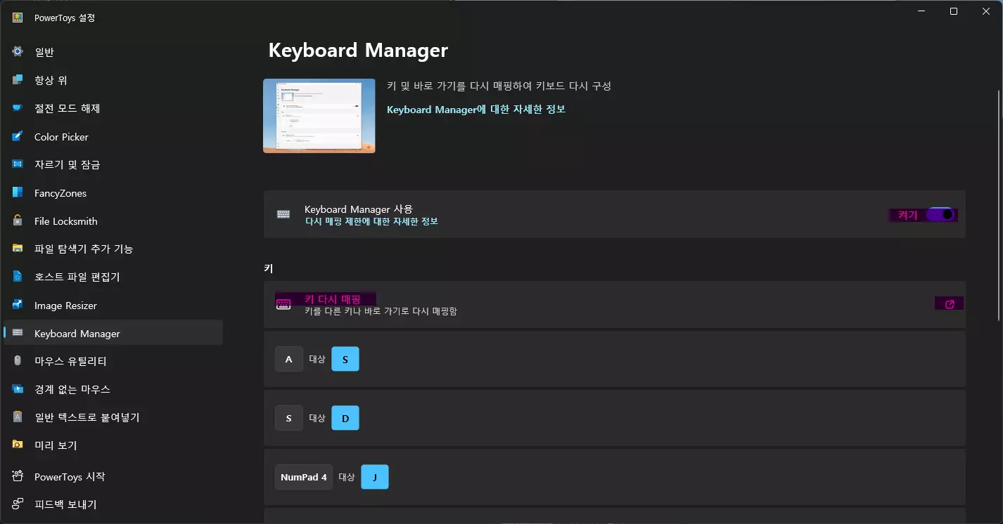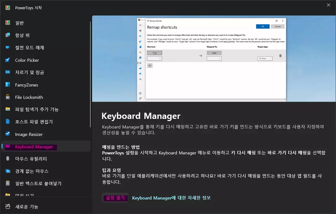 使用键盘管理器进行按键映射 选择键盘管理器并点击【设置打开】按钮,PowerToys设置窗口将新弹出。