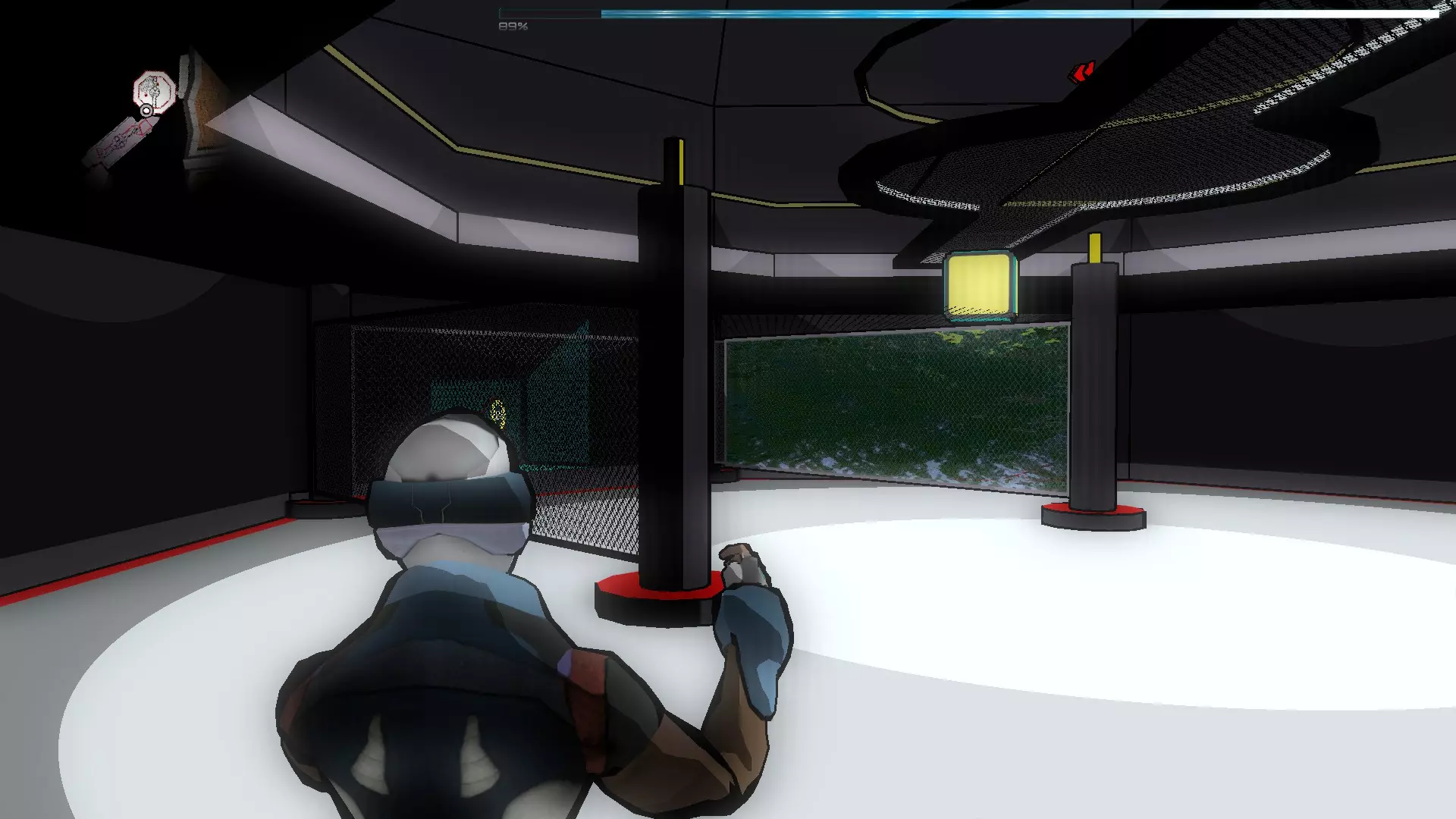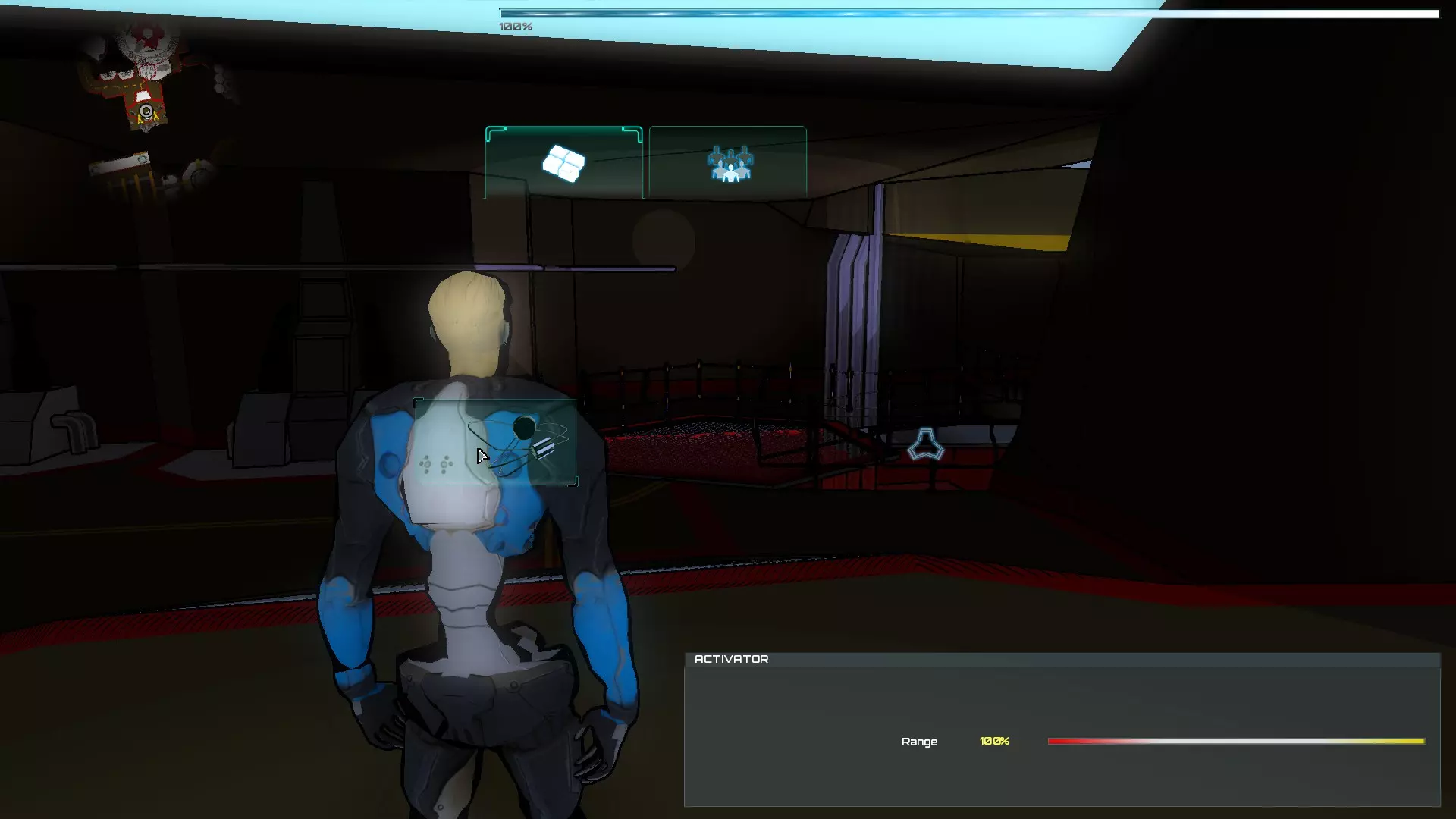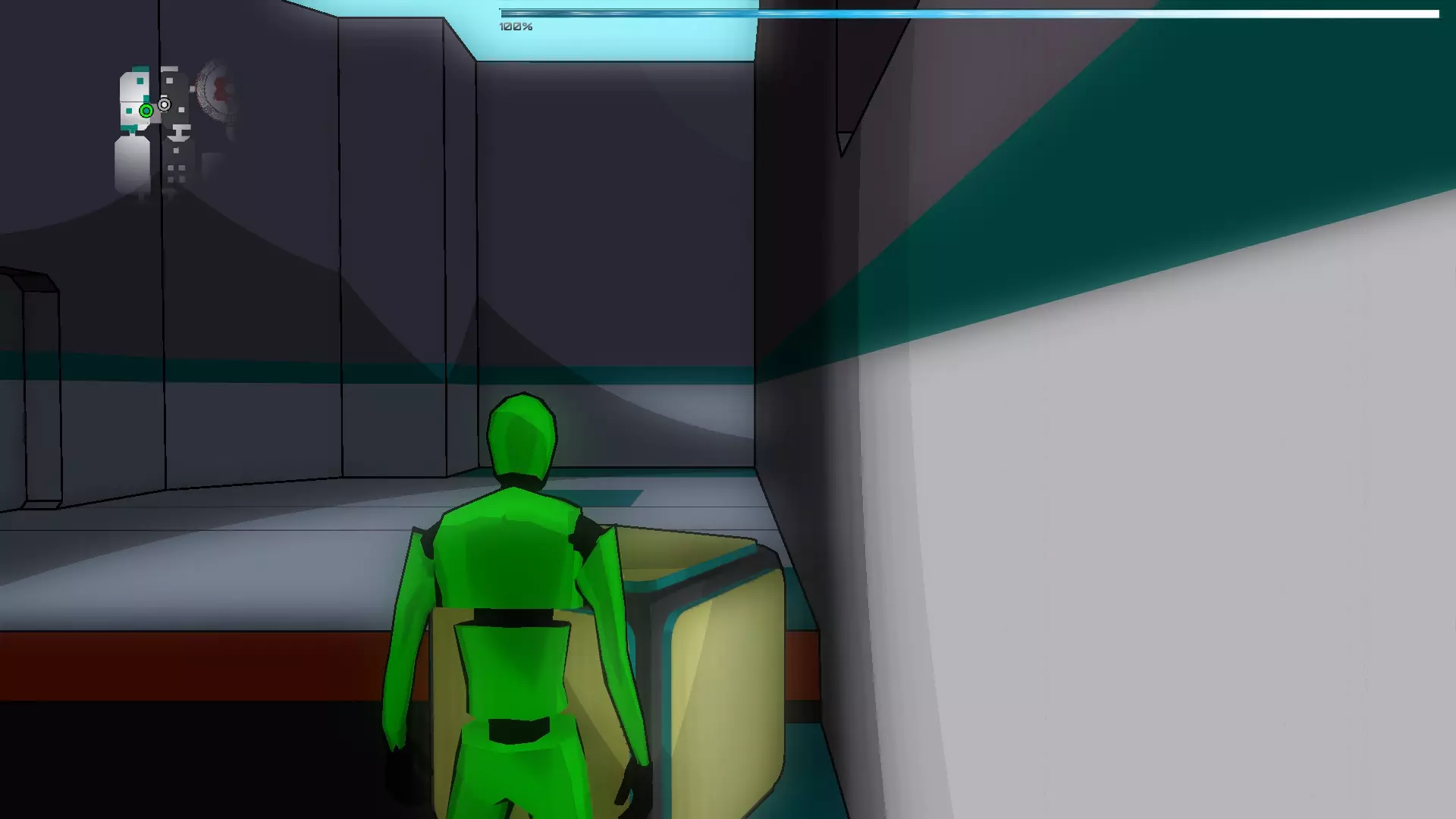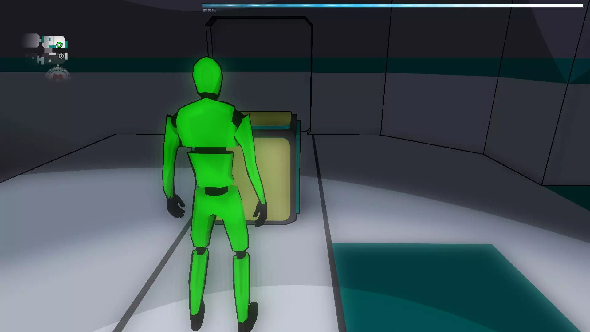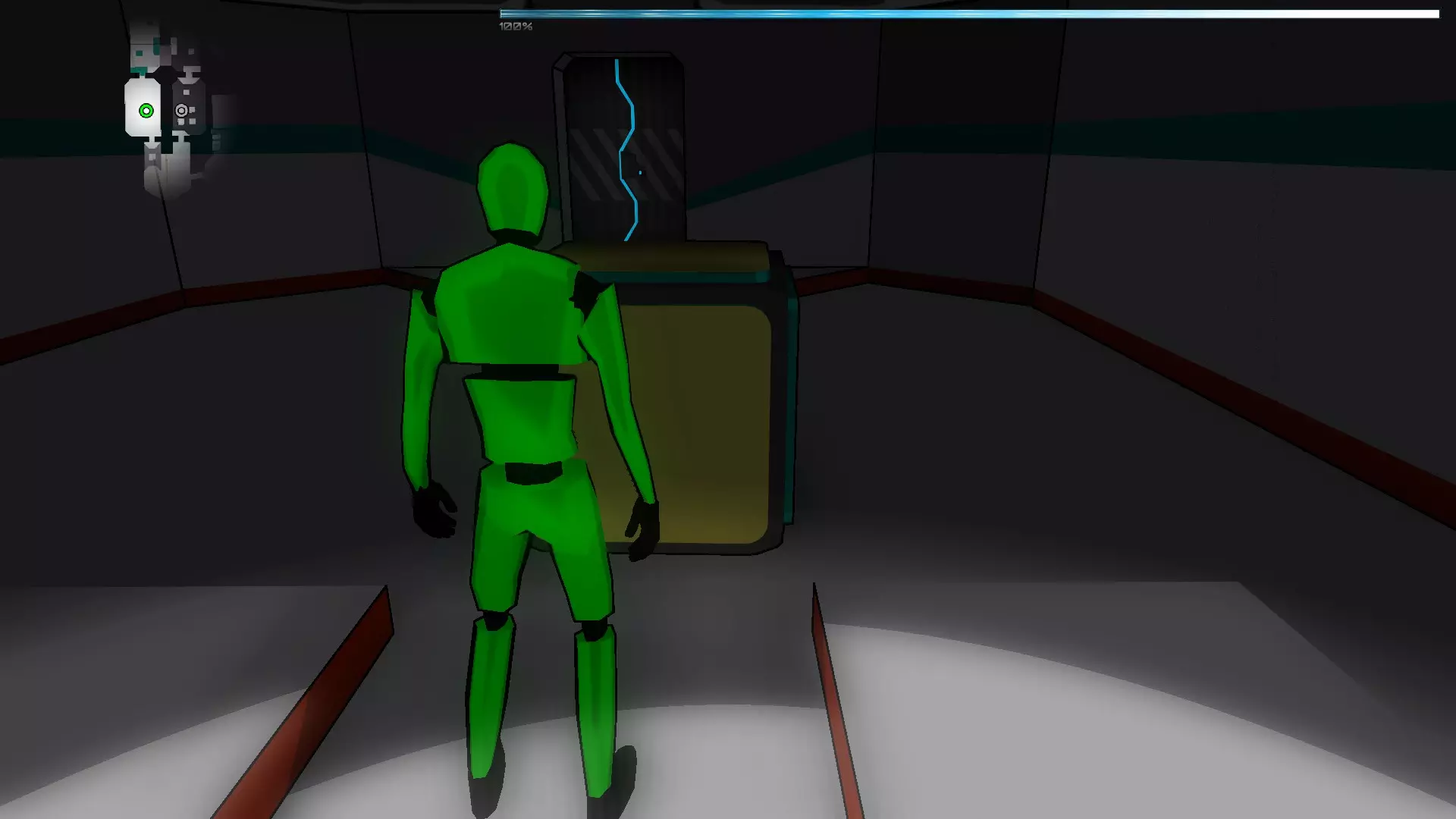 就像你们放置的那样,把方块和假人放在左边,这样连接核心就能收集手榴弹,收集医疗包时也照此操作。 到这里都很简单,现在开始复杂的部分,抵达净化装置终端的门…… 首先你们必须让方块尽可能正对门,并让连接核心站在方块上。 假人视角