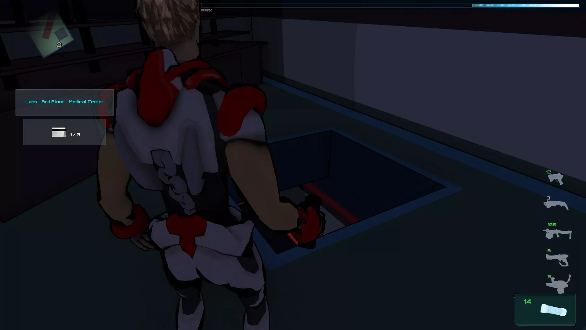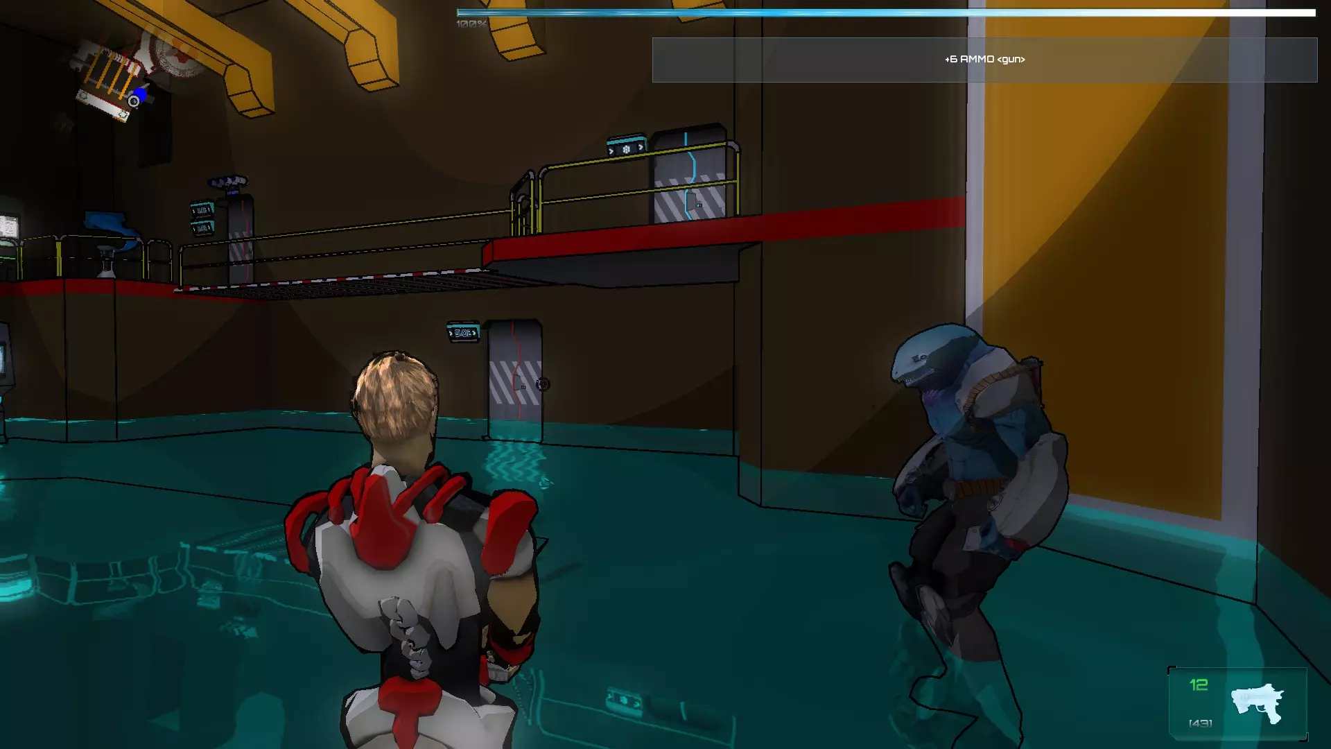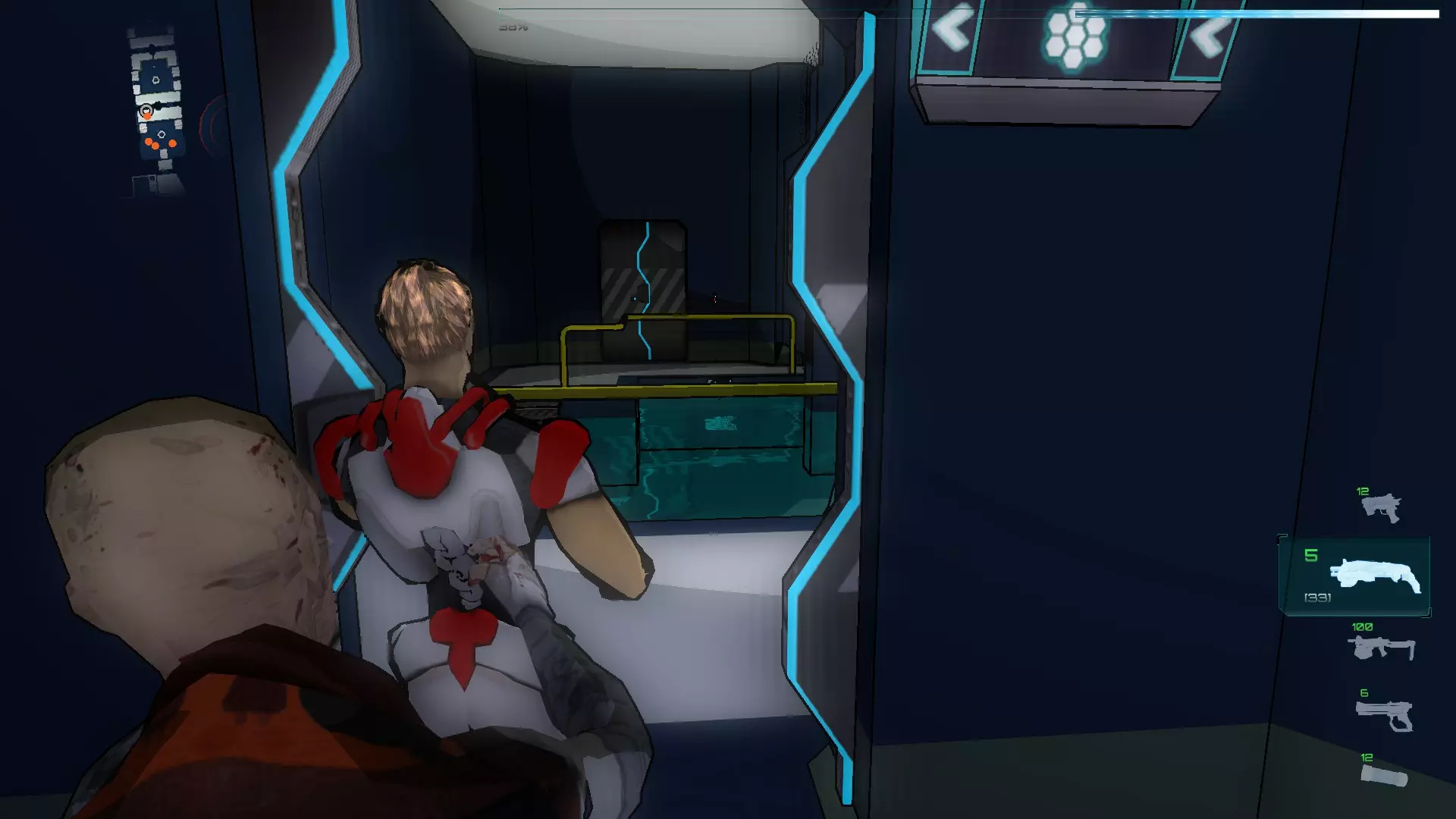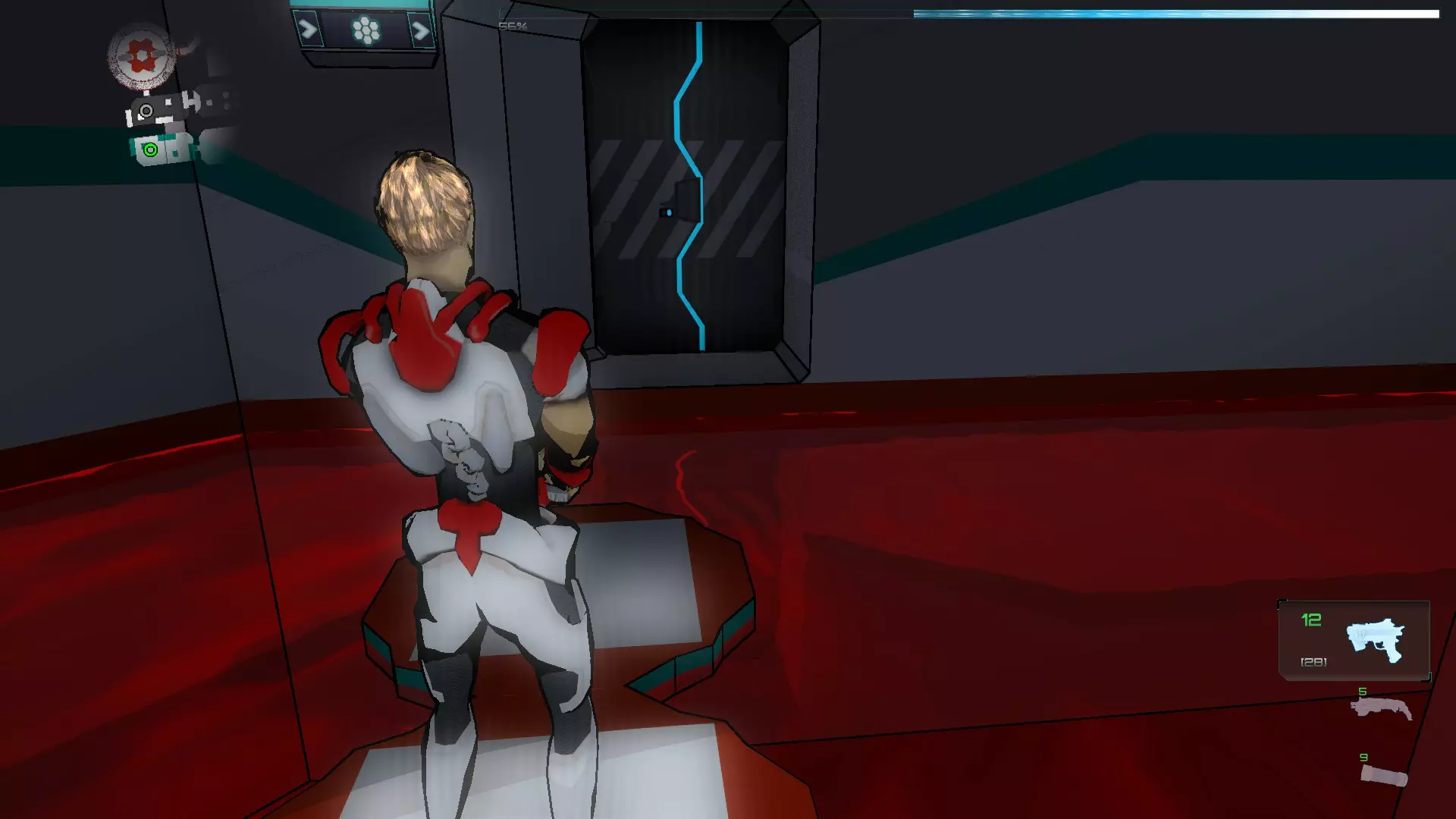 就像你们放置的那样,把方块和假人放在左边,这样连接核心就能收集手榴弹,收集医疗包时也照此操作。 到这里都很简单,现在开始复杂的部分,抵达净化装置终端的门…… 首先你们必须让方块尽可能正对门,并让连接核心站在方块上。 假人视角