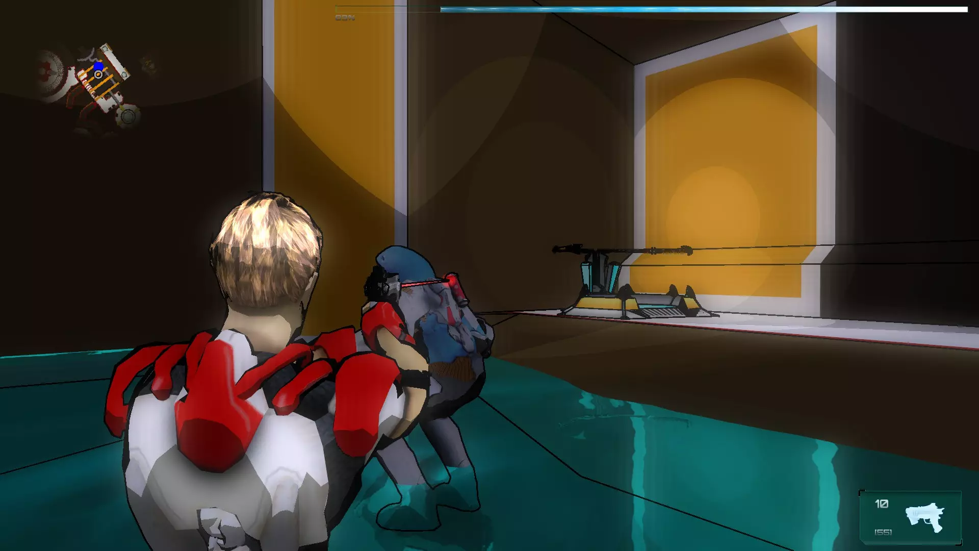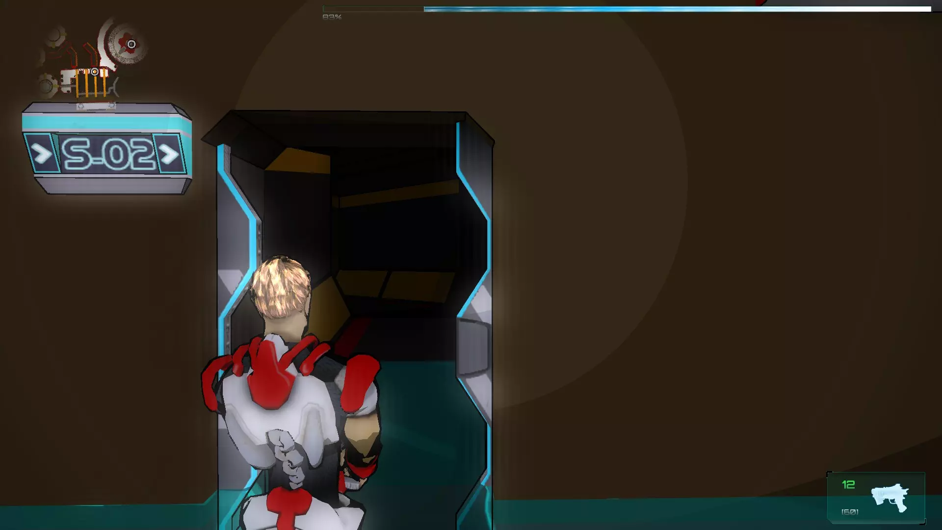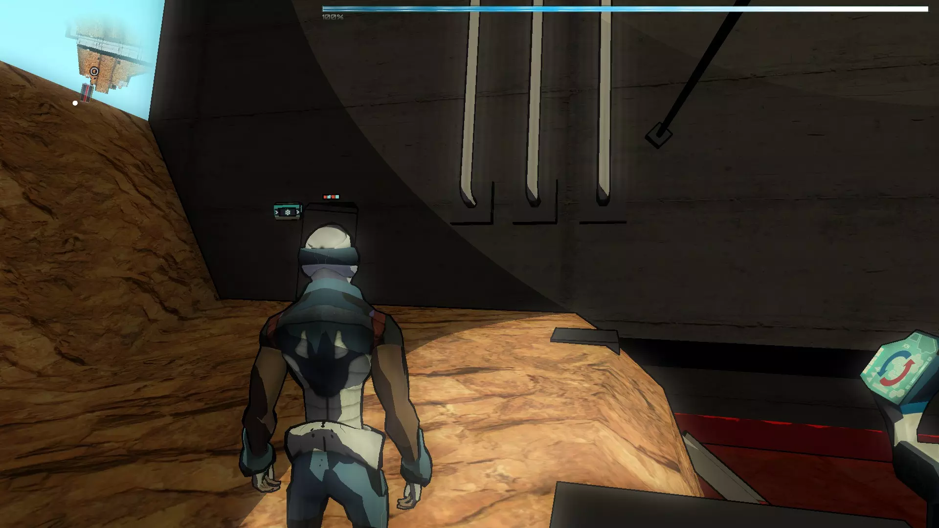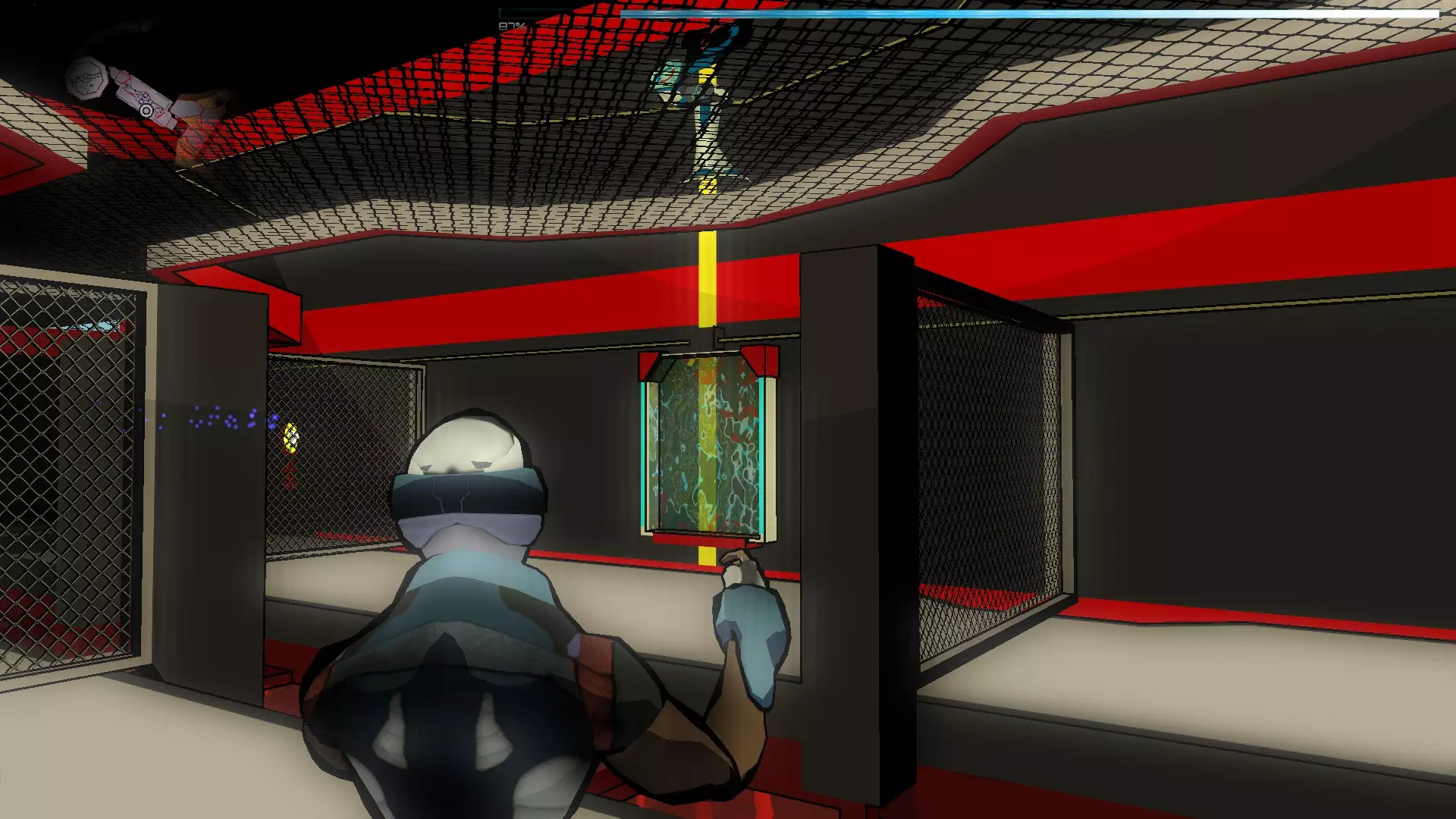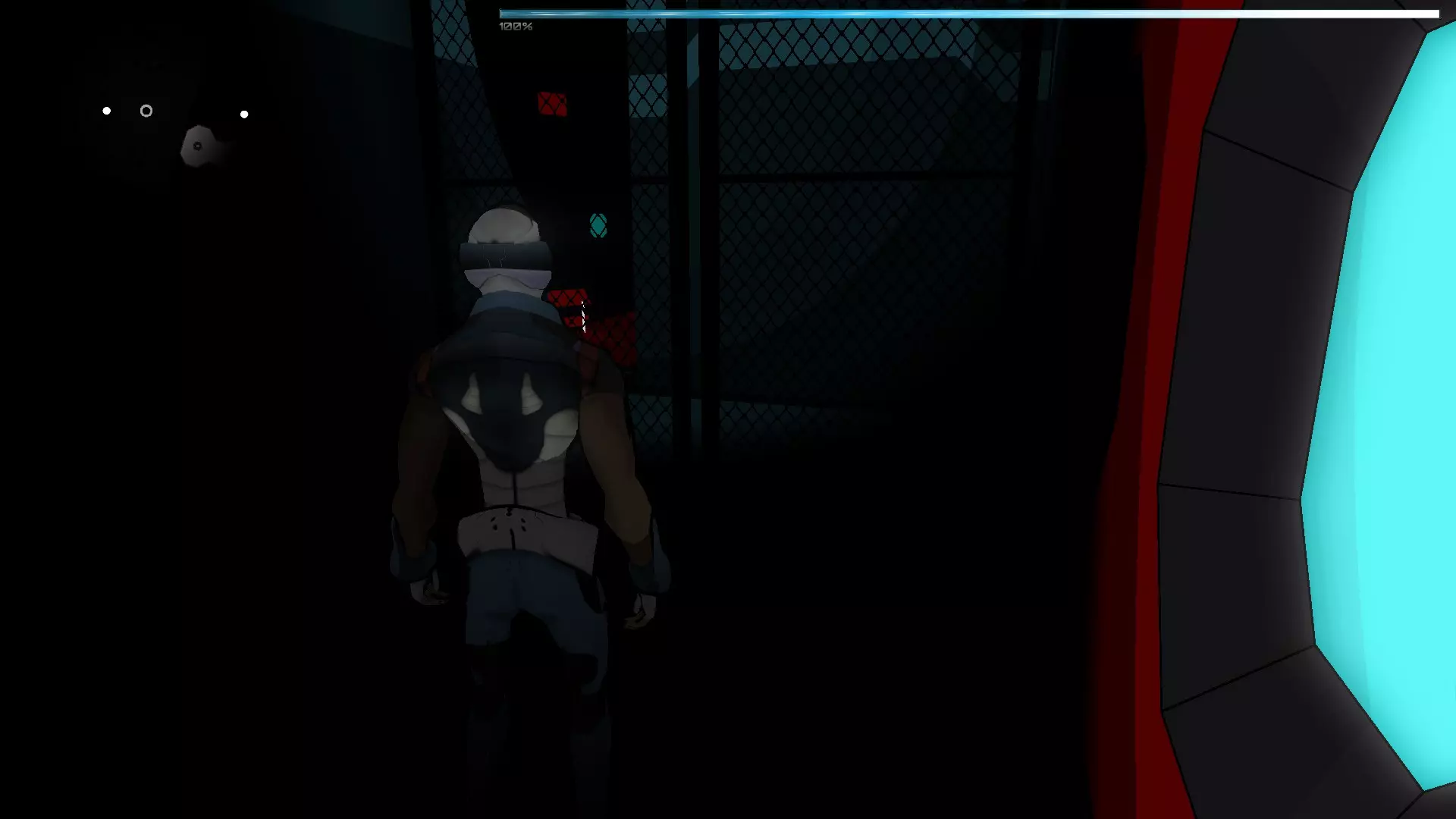 就像你们放置的那样,把方块和假人放在左边,这样连接核心就能收集手榴弹,收集医疗包时也照此操作。 到这里都很简单,现在开始复杂的部分,抵达净化装置终端的门…… 首先你们必须让方块尽可能正对门,并让连接核心站在方块上。 假人视角