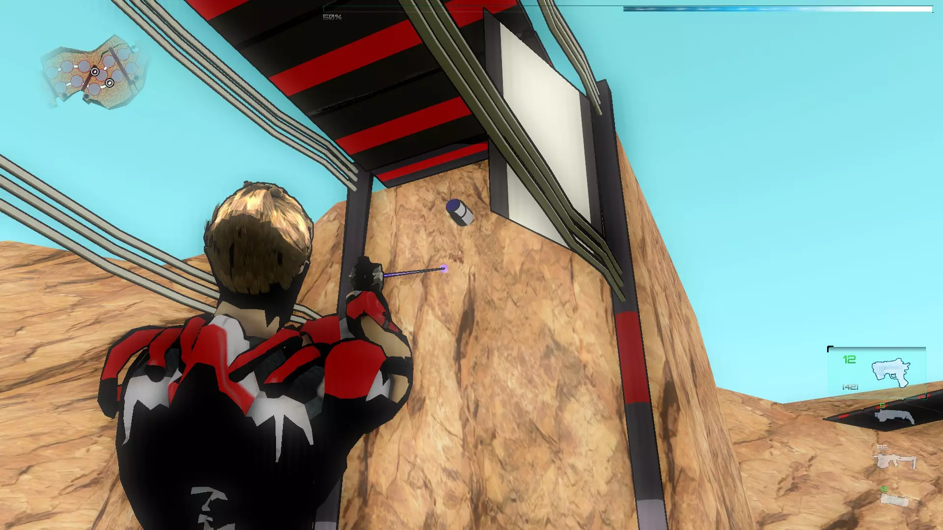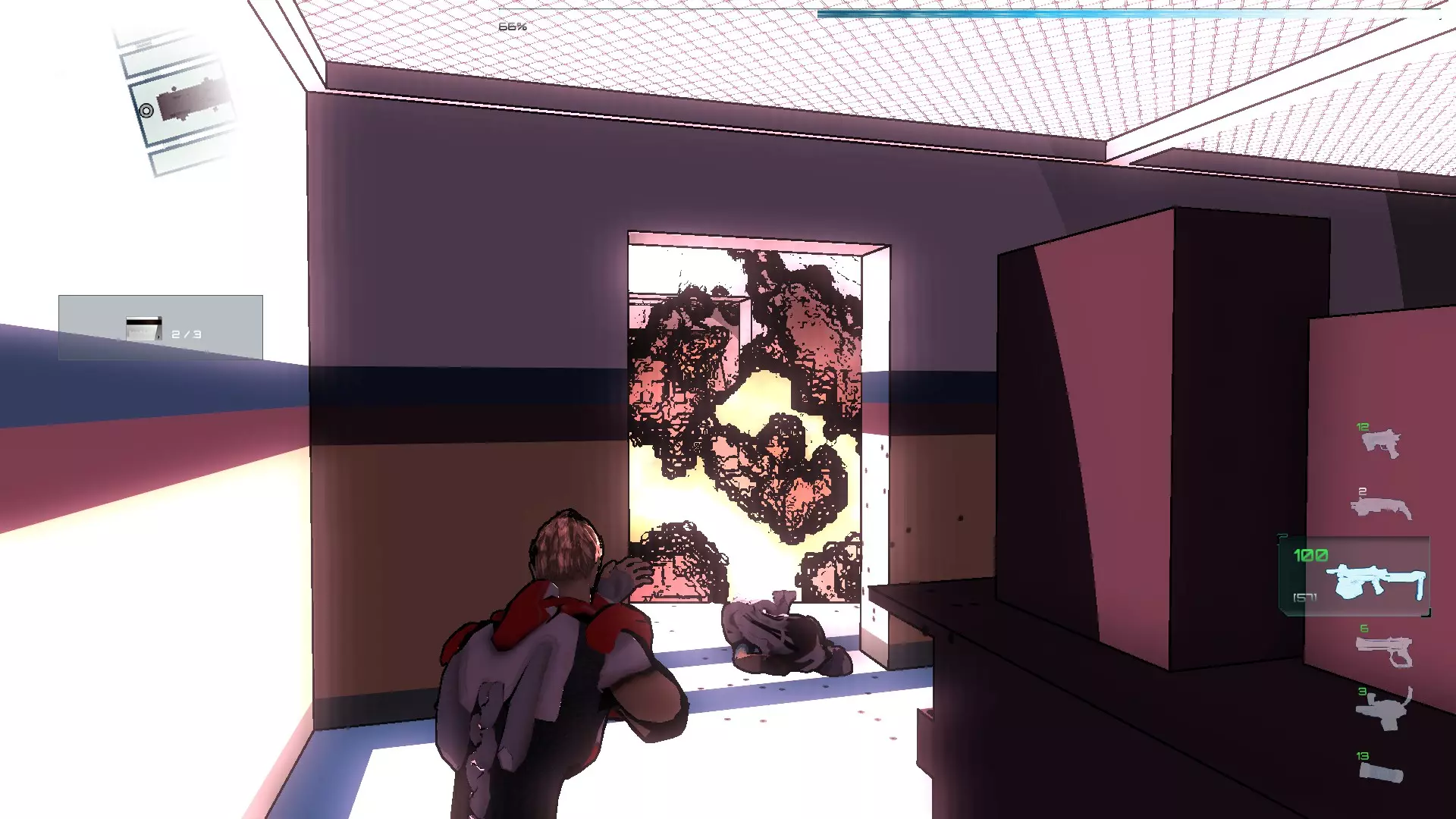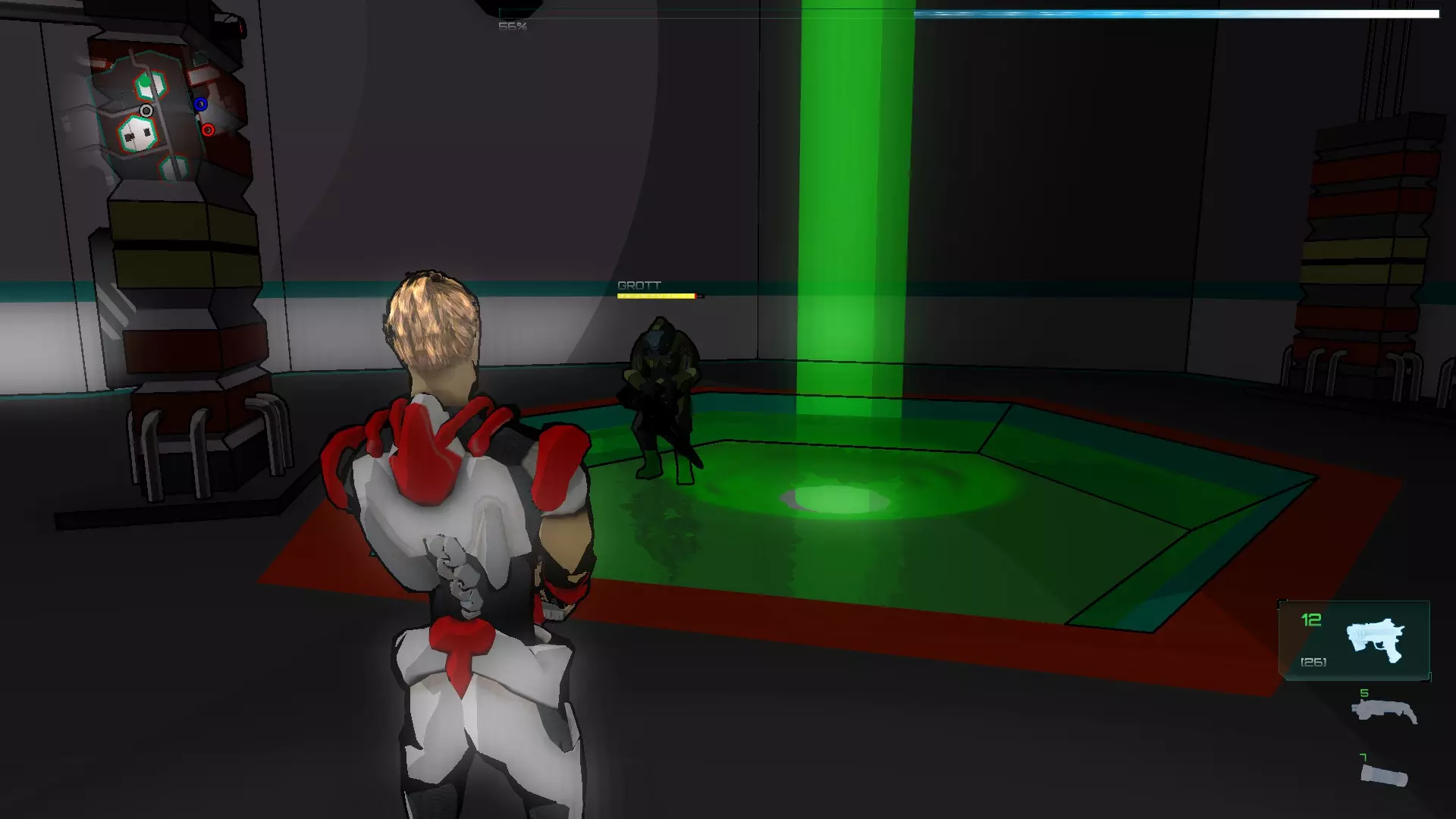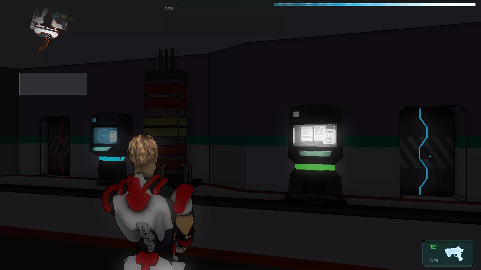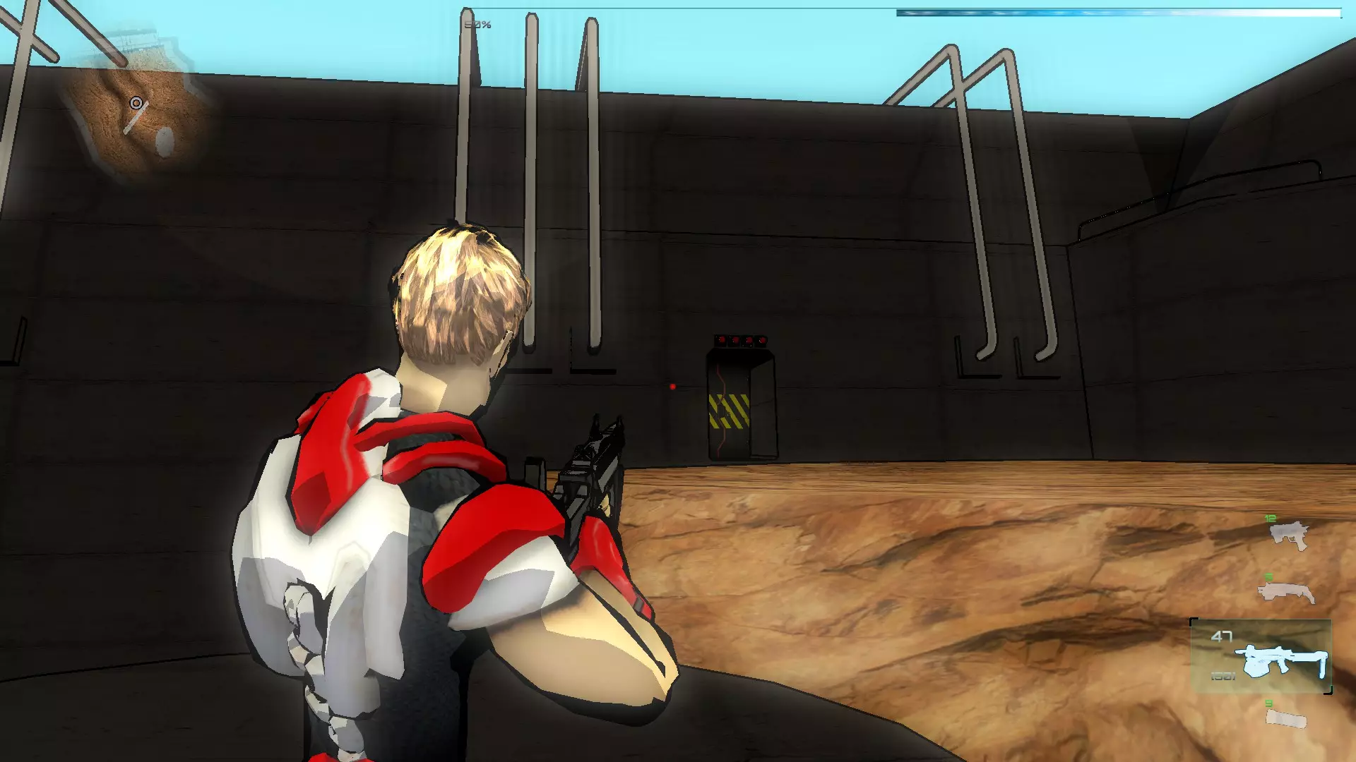 就像你们放置的那样,把方块和假人放在左边,这样连接核心就能收集手榴弹,收集医疗包时也照此操作。 到这里都很简单,现在开始复杂的部分,抵达净化装置终端的门…… 首先你们必须让方块尽可能正对门,并让连接核心站在方块上。 假人视角